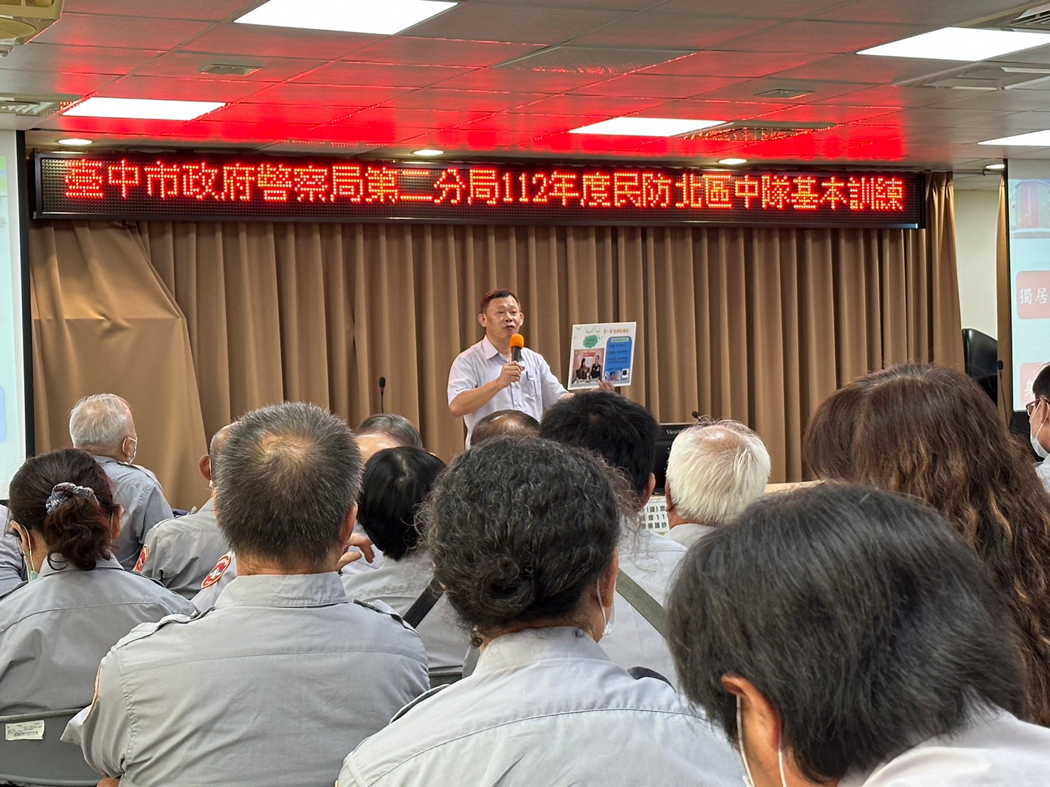為強化支援國土防衛作戰之全民防衛動員準備,並增進民防團隊工作效能及服務熱枕,臺中市政府警察局第二分局於日前整編民防基本訓練,以戰時任務為導向,強化分組訓練,並進行相關專業訓練,聚集建立民間防衛力量與共識,達到民間自衛、自救及互助,建構支援力量,維護國土安全。台中市北區民防中隊成員共計165名,其中有數對父子檔及兄弟檔,同堂訓練深具傳承意義。