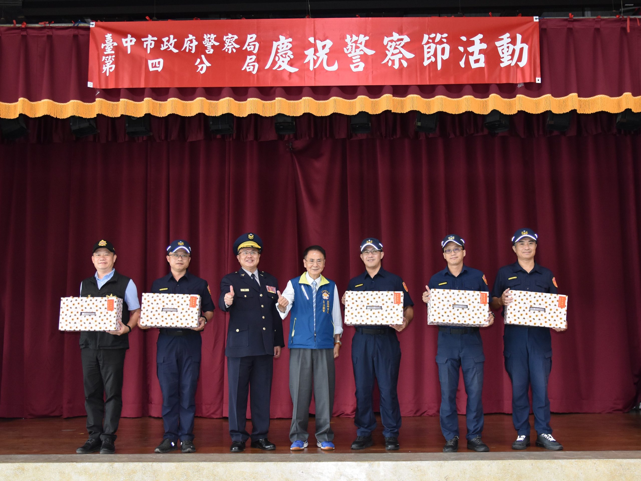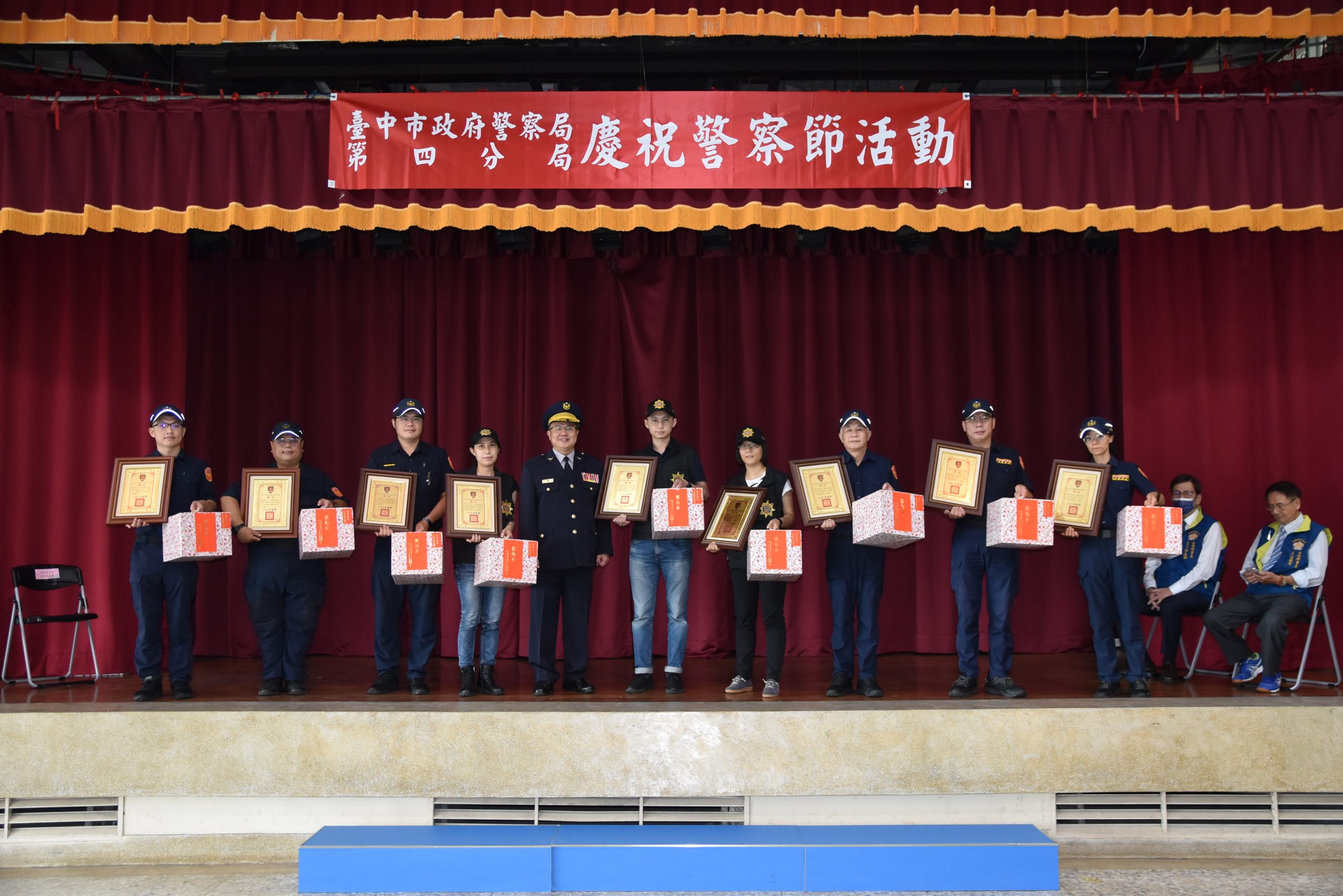 在6月15日警察節前夕,臺中市政府警察局第四分局在分局禮堂舉辦歡慶警察節活動,由分局長李建興主持,會中表揚42位各項績優表現人員,偵防詐欺犯罪部分,破獲詐欺車手、取簿手共86人,成功阻詐共52件,金額高達4,500萬元,加上近期轄內發生「外役監脫逃事件」、「中捷公安事故」等社會矚目治安、交通案件均能迅速查獲及即時疏導,防止危害擴大,有賴警察同仁的付出和努力。這次慶祝大會除現場授獎人員獲頒獎牌、獎金、燜燒鍋禮品外,另轉頒內政部警政署警察獎章,同時亦一併感謝退休員警及安心上工人員的辛勞。
