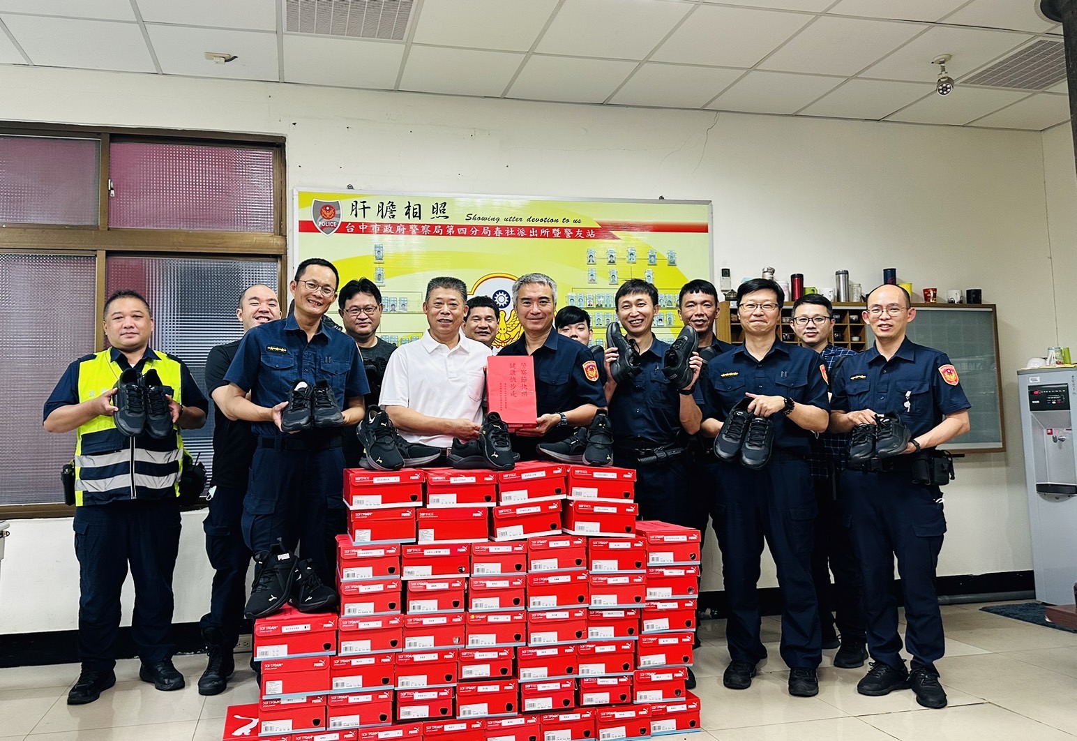 無獨有偶,中市警四分局春社所長邱量虔偕同春社警友站長楊金水加碼選在警察節前夕,暖心添購每人一雙知名運動品牌鞋,柔軟不咬腳的材質讓員警在執勤過程中所產生的疲勞得到舒緩,藉此鼓舞警察工作士氣,酷炫的外型在勤餘的時候可當休閒鞋,超實用禮品,直呼真的送到心坎裡。