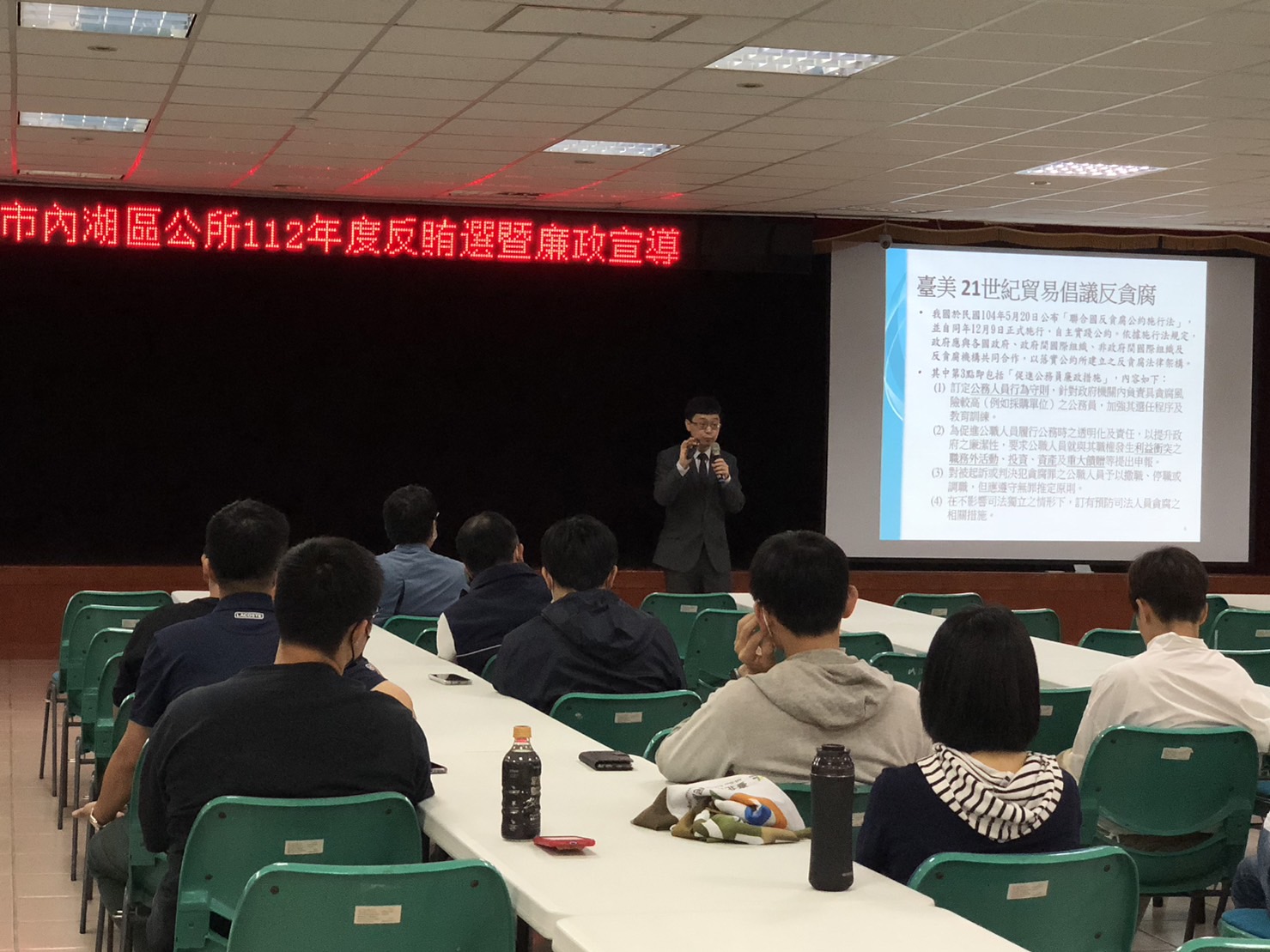 台北市內湖區公所於今(15)日邀請士林地方檢察署檢察官周禹境,講授反賄選與廉政知識等內容,持續深化反賄選宣導與廉能意識。區公所政風室表示,因應明年初總統與立委選舉將至,特請周檢察官蒞臨講授,使反賄選觀念與廉能意識能內化至同仁心中,使渠等能確實了解法律上對於賄選以及貪污治罪條例之實務看法,預先防範可能產生之爭議,避免誤觸法網,進而維護乾淨選風並促進廉潔形象。