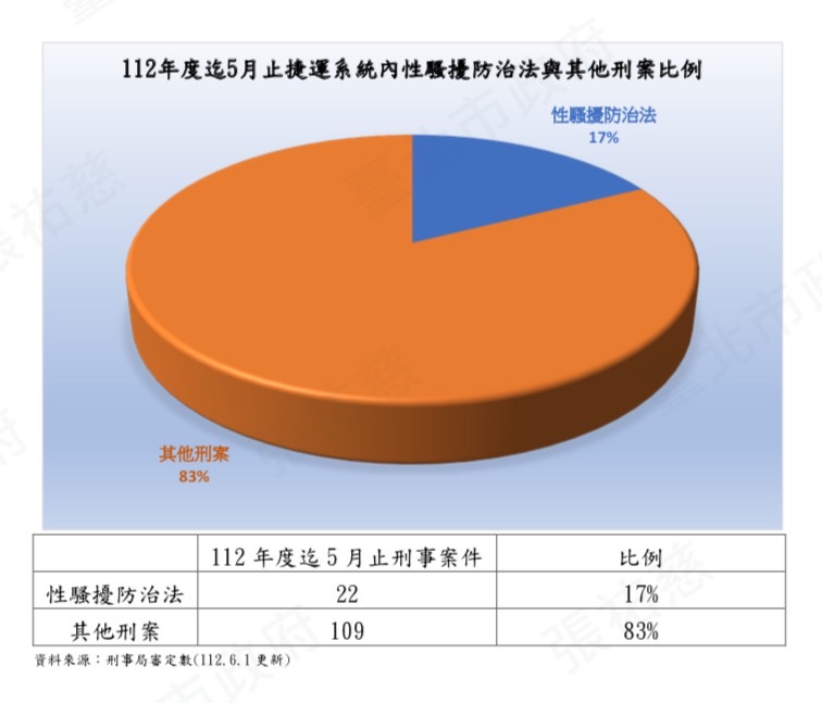 根據臺北市政府警察局捷運警察隊統計,本(112)年度迄5月止發生之性騷擾案件共計22件,約占捷運系統內刑案發生數之17%,進一步分析犯案手法,多半利用上下班車廂人潮眾多且擁擠的時段,趁被害人不備觸碰其身體隱私部位;捷運警察隊呼籲,依據性騷擾防治法第25條第1項規定,意圖性騷擾,乘人不及抗拒而為親吻、擁抱或觸摸其臀部、胸部或其他身體隱私處之行為者,依法可判處二年以下有期徒刑、拘役或科或併科新臺幣十萬元以下罰金,民眾勿因逞一時私慾而輕蹈法網、終生追悔莫及。另提醒民眾若遭到性騷擾,應當立即遠離危害並記下嫌疑人的特徵,如在捷運站體內遇到性騷擾,可以請求保全或站務人員協助,若是在列車上,則可按下捷運車廂內之紅色緊急通話鈕請求司機員協助,警方獲報後將立即趕往現場處理,盡量避免與嫌疑人產生衝突,以免危及自身安全。