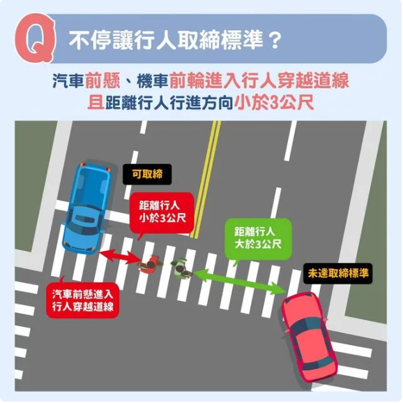 警方今日指出,為了擺脫「行人地獄」惡名,先前交通部及相關單位研議「只要行人穿越線有人,無論遠近,車輛都要停下讓行」標準過於嚴苛,引發民怨,因此最後認定機車駕駛人不禮讓行人標準仍維持「車輛距離行人行進方向3公尺內或少於3個枕木紋即須停讓」,違規者從原本最高可罰3600元增至6000元,記點3點,且須參加道安講習3小時。