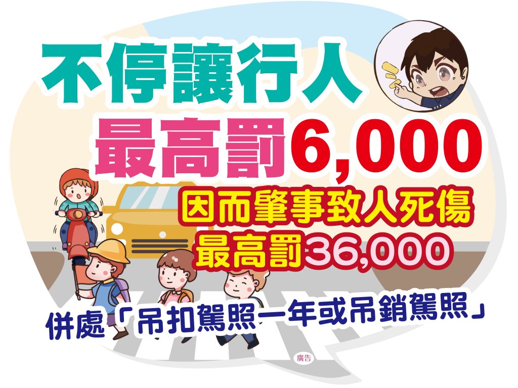 新修正道路交通管理處罰條例已於 112年6月30日上路施行,駕駛「不停讓行人」可處最高新臺幣6,000元罰緩,併處違規記點3點及道安講習3小時;若因而肇事致人死傷者,處新臺幣7,200以上3萬6,000元以下罰鍰,併處吊扣駕照一年或吊銷駕照,對當事人影響甚鉅,不可不慎。