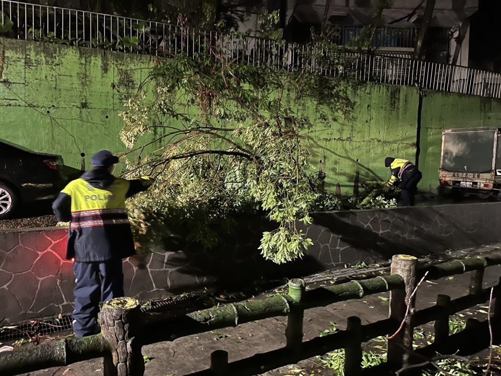警方到場後發現倒塌路樹占據整個車道,雙向皆無法通行,所幸現場無人員傷亡,警方立即拉起封鎖線、擺設交通錐警示,實施交通疏導、管制車流,徒手先將倒塌路樹移置路旁,迅速清除完畢後全線恢復通車。