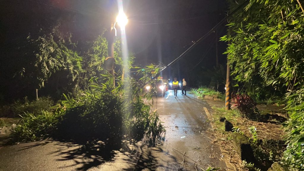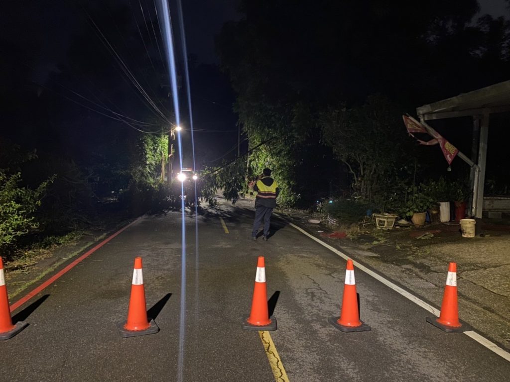爲避免過往人車發生危險,員警立即實施交通管制,並主動先行協助清除移置安全路旁,並通報里長及市府相關單位後續清運移除,執勤過程員警冒著強風豪雨,確保用路人行車安全。