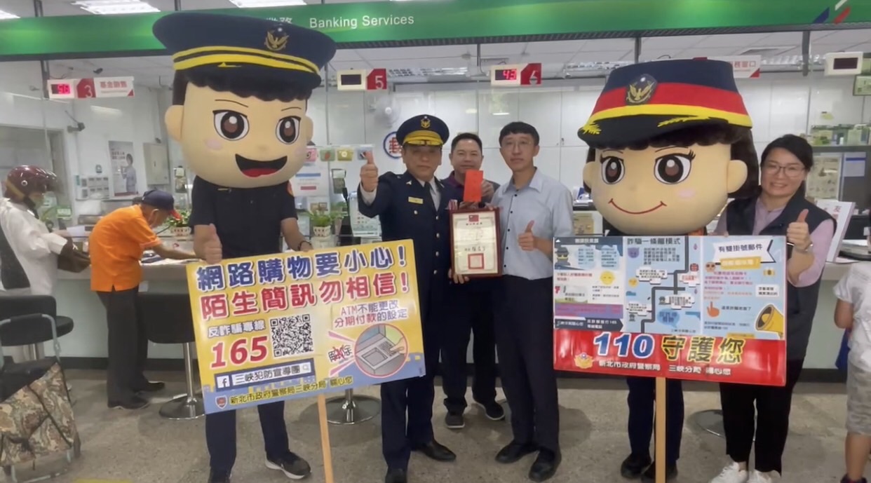 新北市三峽警分局長上週24日親率反詐宣導團隊走進金融機構,以最親切最直接的方式與民眾面對面宣導,強化反詐騙意識,積極守護民眾財產安全,本次前往轄內三峽中山郵局、新光銀行三峽分行、中國信託三峽分行等金融機構,致贈新北市政府感謝狀、禮券等予近期成功攔阻民眾遭詐的行員,感謝他們保住民眾荷包與警方共同防制詐騙。