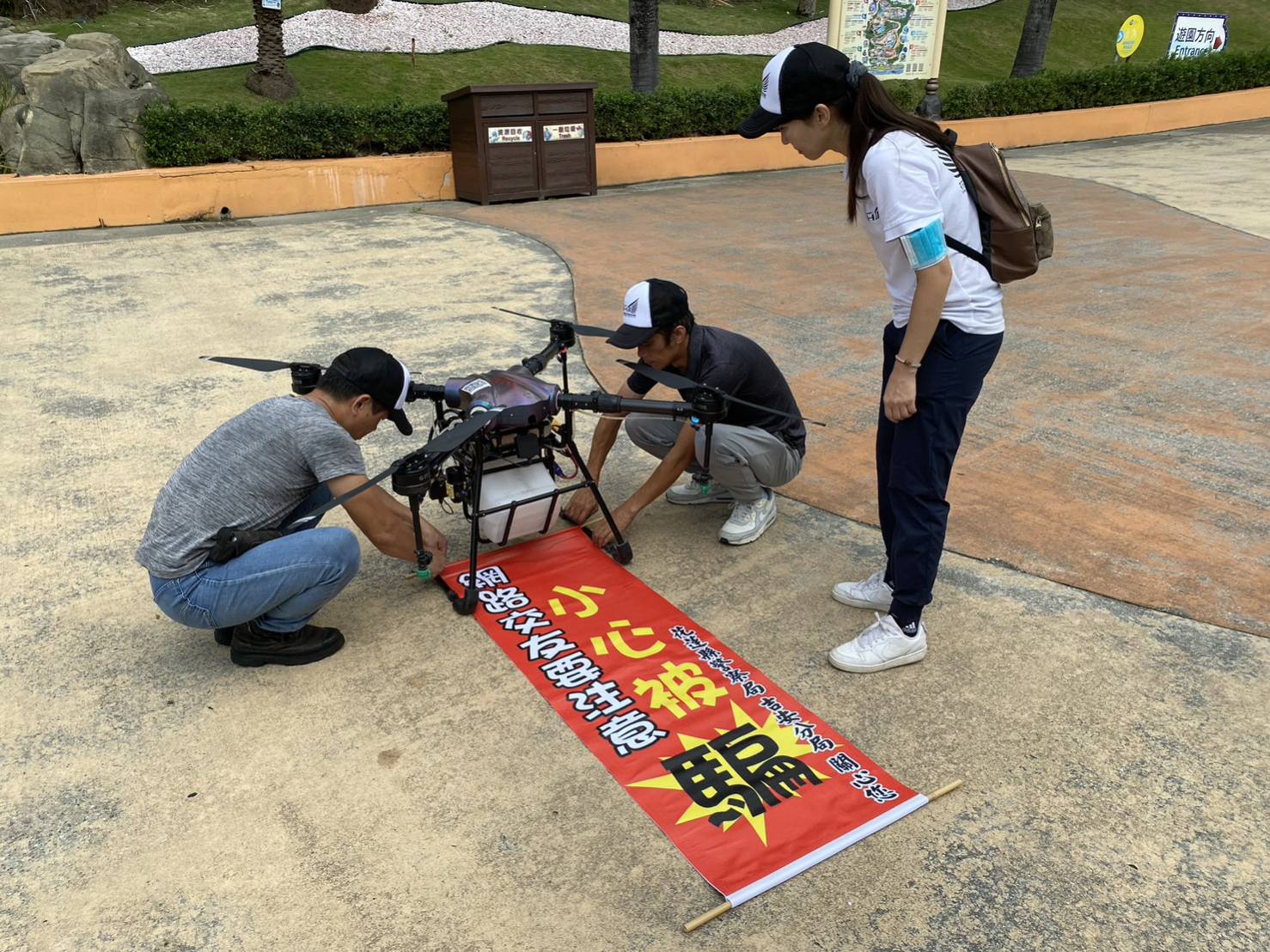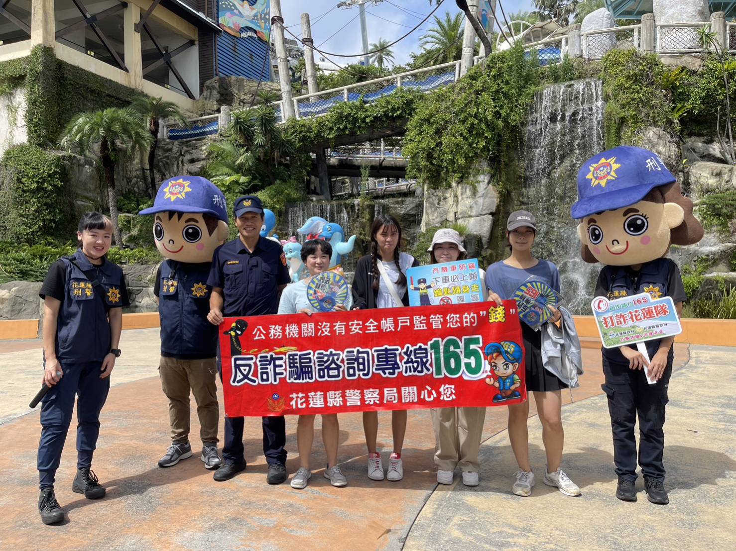 為了提高民眾對詐騙的防範意識,吉安警分局偵查隊長王世光、鹽寮派出所所長黃鏡峯於9月5日早上9時,在花蓮遠雄海洋公園舉辦創意快閃防詐宣導活動,邀請無人機應用發展協會協助操作農用無人機,將「網路交友要小心,小心被騙」的宣導布條高高掛在空中,吸引遊客的目光。同時,警方也與海洋公園的吉祥物和刑事警察娃娃一起與民眾互動,發放小禮物和宣導摺頁,用有趣的方式教大家如何防止被騙。