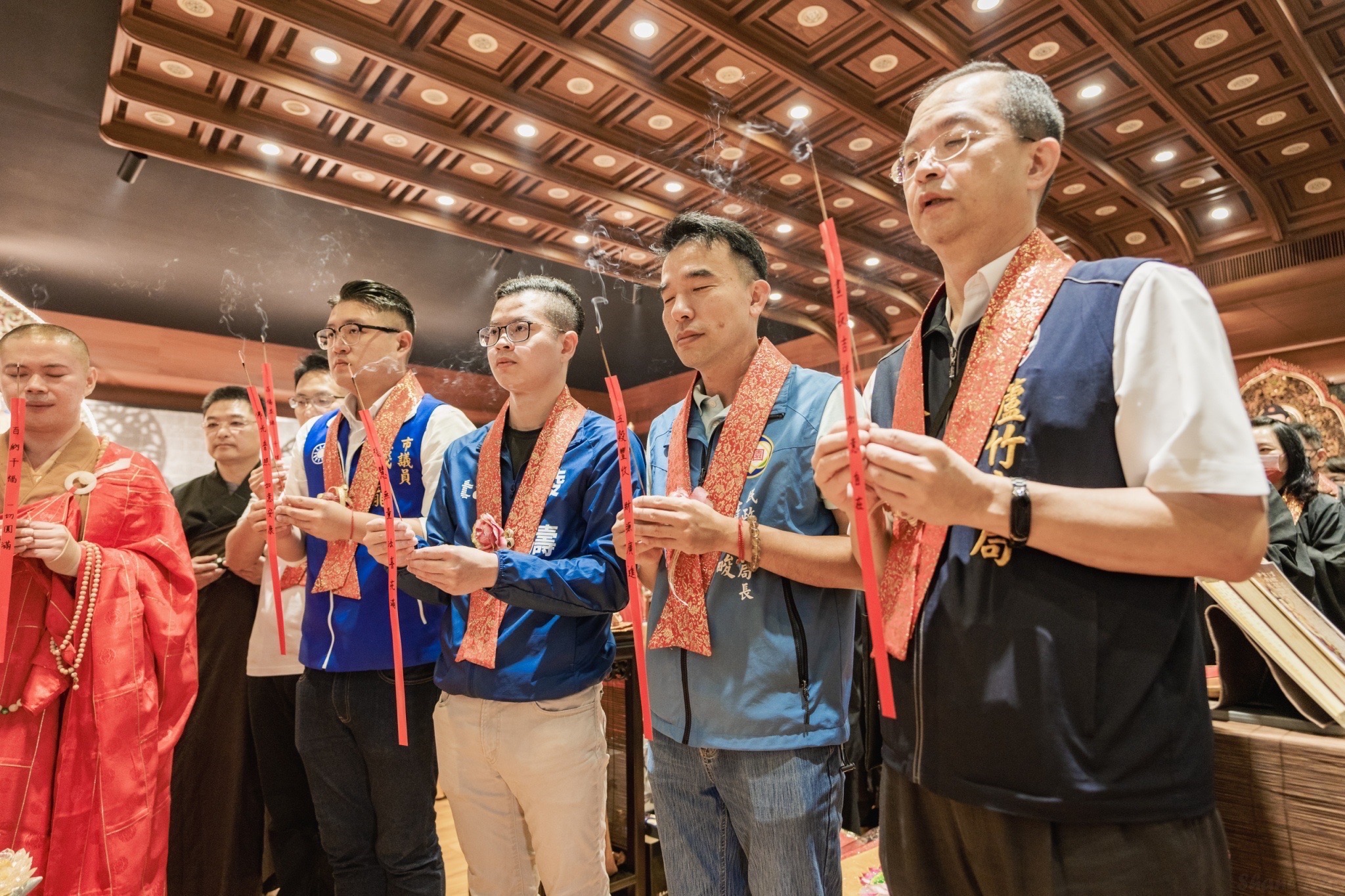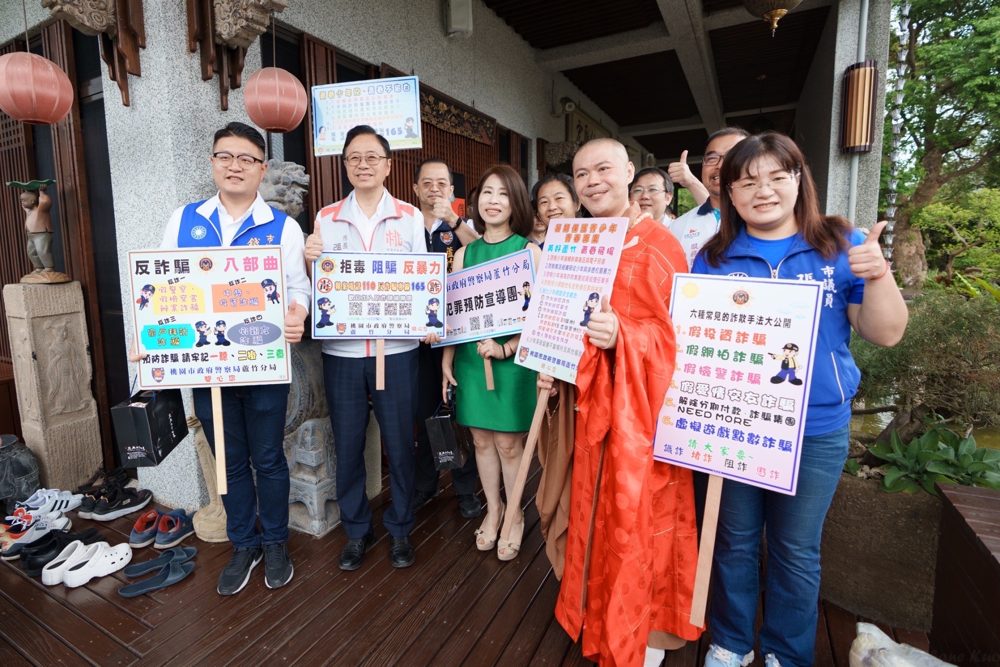桃園市長張善政8日上午至蘆竹區仁愛路參加宏願大千世界 《無國界祈安超薦報恩大法會》與僧信齊心誦經禮懺,望以此功德普皆回向,國家社會人民安康,龍天護佑災難止息。蘆竹警分局也受邀參加,並結合市府民政局宗教科、蘆竹區公所等於現場進行反詐騙宣導,強化民眾自我防詐意識。