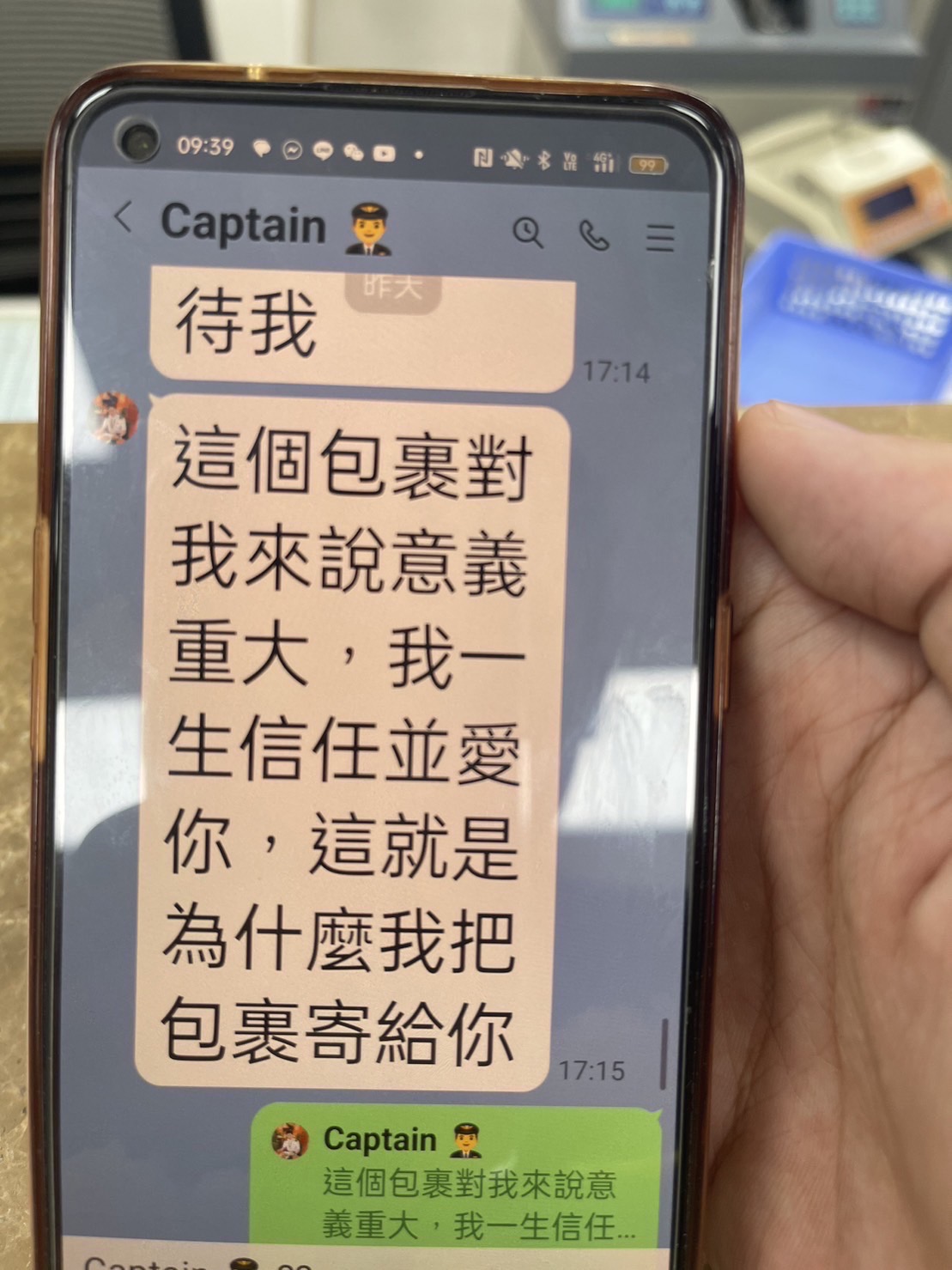 據了解,57歲鄭婦是透過臉書結識自稱是國內某航空機長,外型年輕又相當帥氣迷人,近日頻對鄭婦噓寒問暖,並於昨(13)日稱欲寄送驚喜包裹予鄭婦表達愛意,表白「這個包裹對我來說意義重大,我一生信任並愛你,這就是為什麼我把包裹寄給你」,佯稱需付海關費用新臺幣12萬5800元,並要求鄭婦匯款後包裹才能順利取得;正當鄭婦至銀行匯款時,行員察覺有異,隨即友善通報板橋派出所員警到場協助。