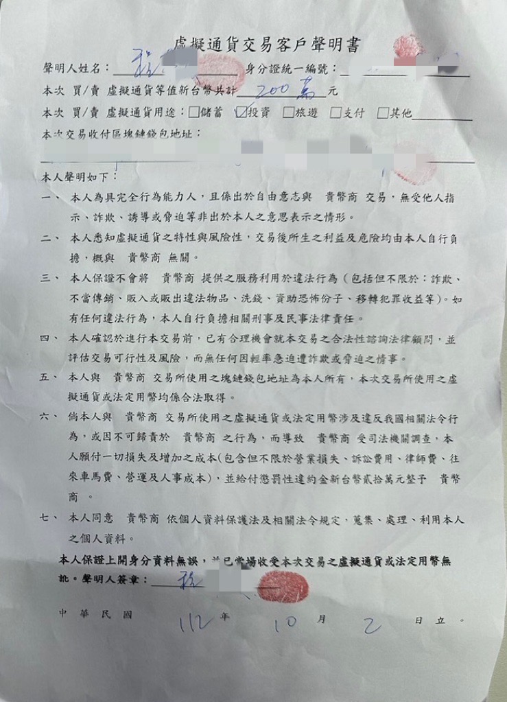詐團於昨(2)日下午5時許,通知程女在板橋區國光路一處咖啡店交付新臺幣200萬元,專案人員佯裝顧客於現場埋伏,待犯嫌楊O義(男、94年次)與程女面談接洽,簽訂「虛擬通貨交易客戶聲明書」假文件完畢,交付贓款時,警方見機不可失,立即上前表明身分,現場查扣犯罪聯繫手機1支,由於涉案事證明確,警方帶回後,依詐欺罪、洗錢防制法移送偵辦。