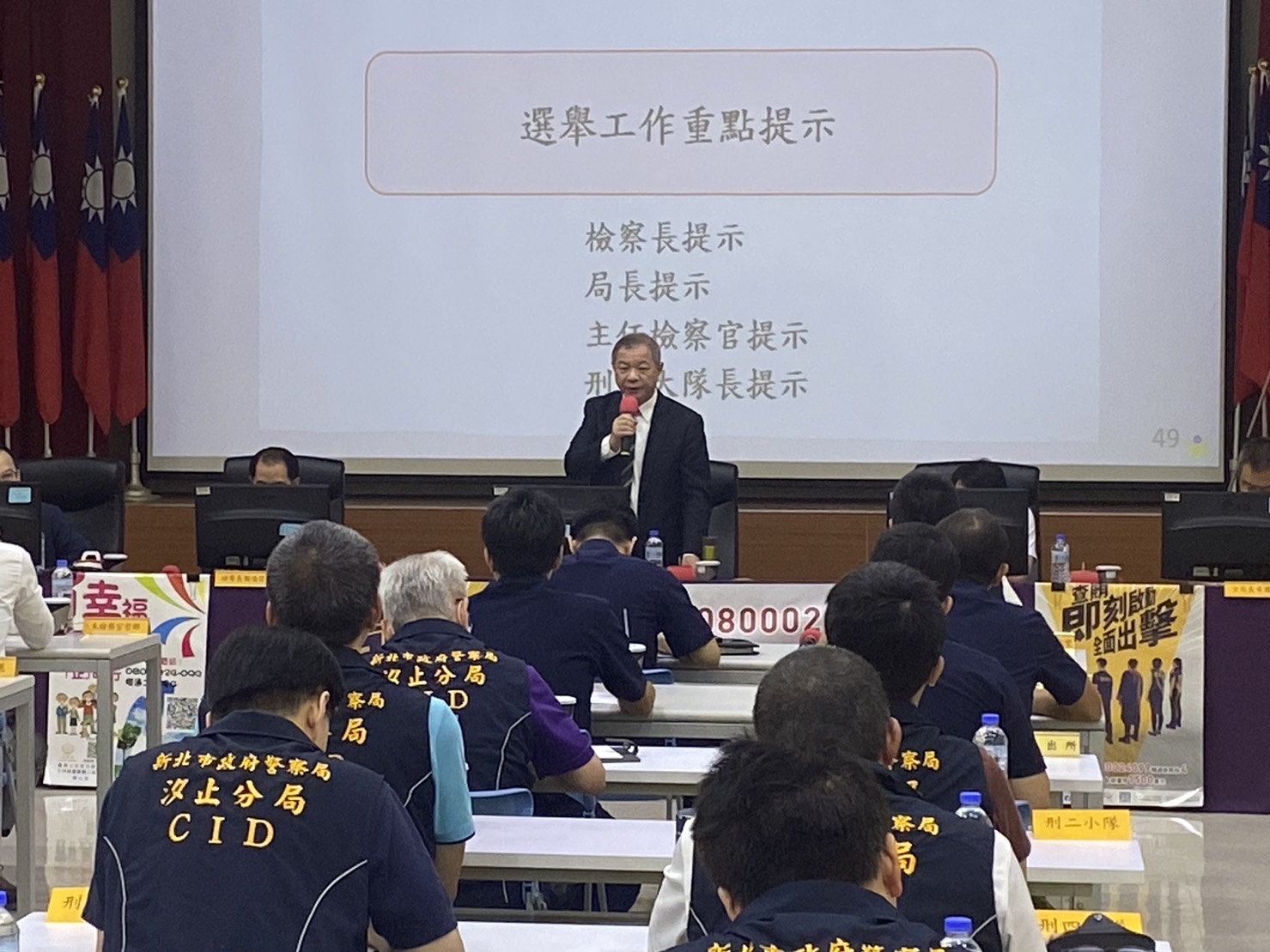 應明年正、副總統大選及立委選舉治安需要,臺灣士林地方檢察署顏迺偉檢察長率領陳彥章主任檢察官、周芝君主任檢察官及分區檢察官等與新北市政府警察局廖訓誠局長、刑警大隊蕭瑞豪大隊長,蒞臨汐止警分局進行聯合訪視,就選舉查察實務、法令及案例三大面向,與偵查隊隊長、小隊長、派出所所長共同研討說明,同時指導查賄制暴工作重點。