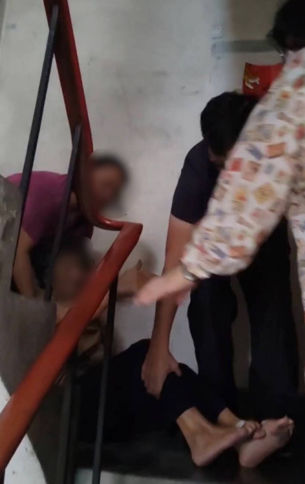 82歲辜姓老婦就醫完到住家樓下樓梯間體力不支,樹林暖警「公主抱」護送回5樓家中,家人一再表示感謝。(記者張艷君翻攝)
