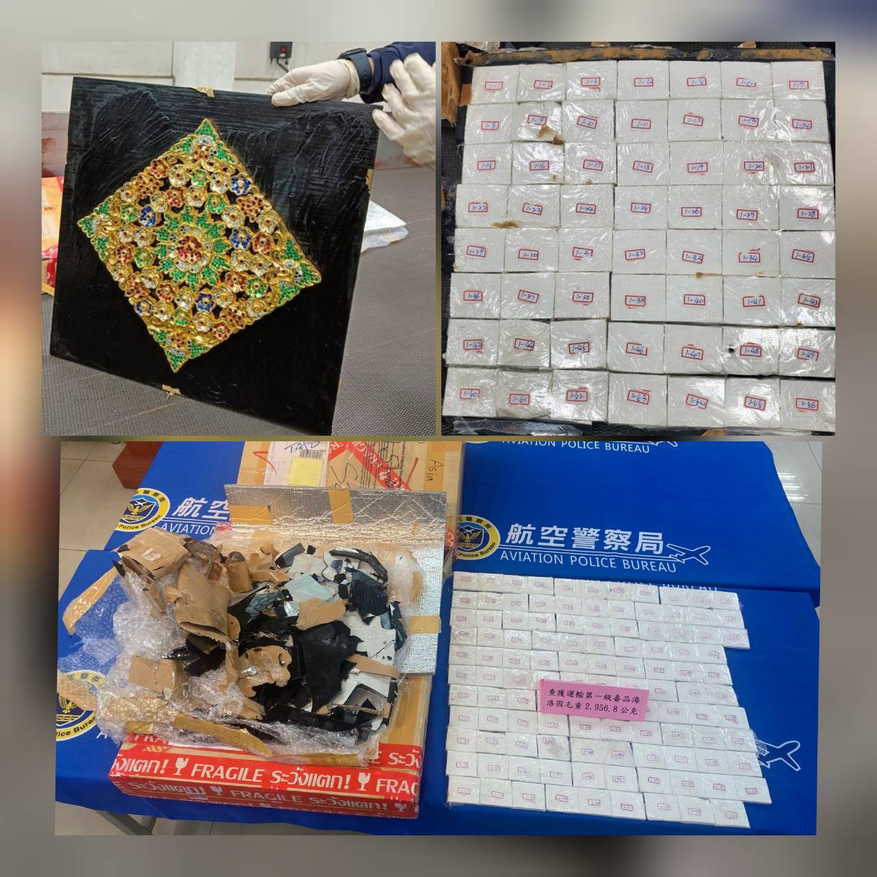 航警局表示,今年3月8日在桃園國際機場UPS美商優速比快遞進口專區查獲包裹以畫框夾藏第一級毒品「海洛因」(毛重2,956.8公克),航警局隨即報請桃園地方檢察署檢察官指揮偵辦。