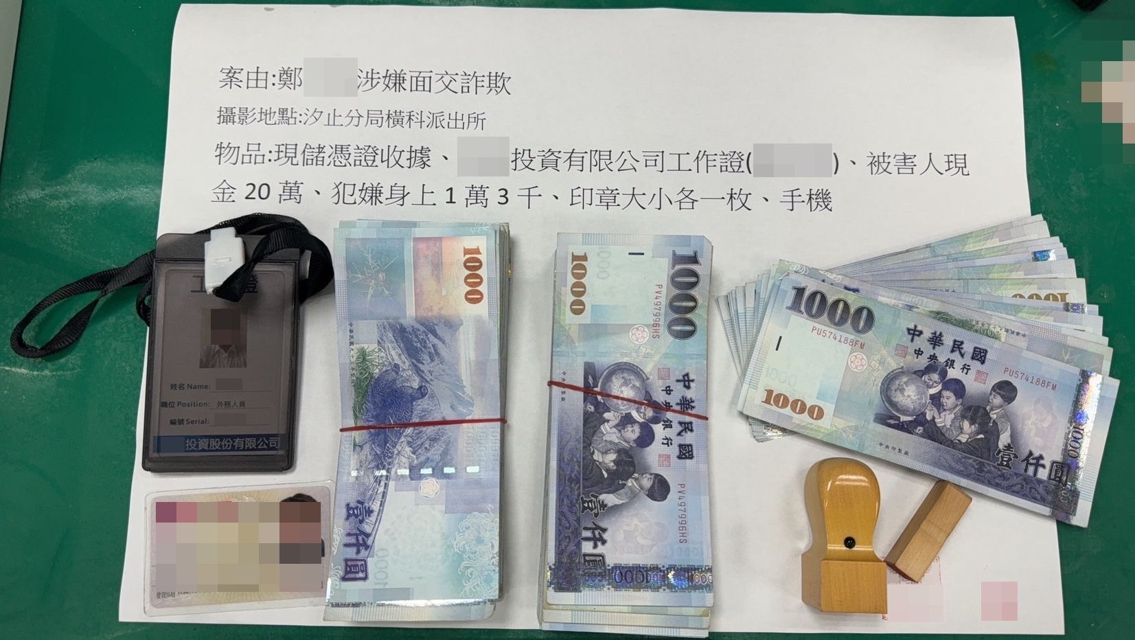 於當(15)日下午16時20分許,鄭姓女車手(85年次)出現在面交地點收取被害人20萬元現金時,警方立即衝上前將女車手逮捕,並當場查扣手機1支、現儲憑證收據1張、投資公司工作證1張、大小章各一枚、被害人現金20萬元及現金1萬3千元(車手自稱係在火鍋店打工的薪水非犯罪所得)等證物。被害人當下才恍然大悟驚覺遭到詐騙,連忙向前來的員警道謝並表示:「還好有碰到你!」全案警方詢後於翌(16)日將車手依詐欺、洗錢防制法罪嫌移送士林地檢署偵辦。