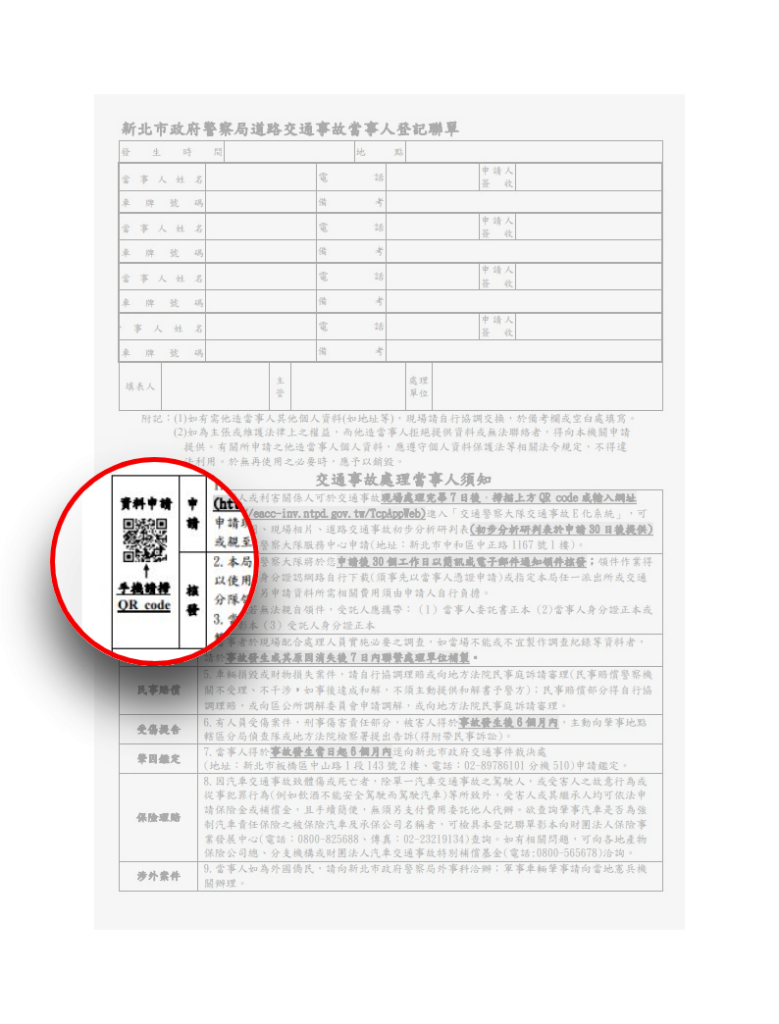 為提升民眾便民服務,自112年11月1日起,於道路交通事故當事人登記聯單中新增QR碼,提供處理員警於事故現場及相關表件中使用,民眾可透過手機掃瞄QR碼完成申請作業,並可於臨櫃或電腦網路下載交通事故資料電子檔(包含現場圖、照片及初步分析研判表),提供民眾更快速便捷之申請及零距離的領件服務。