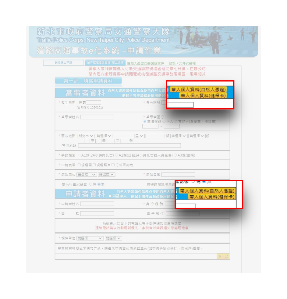 另外新北市交通警察大隊網站「道路交通事故E化系統」已自112年7月1日起提供單一身分認證服務,民眾除臨櫃申請領件外,同時增加提供自然人憑證及健保卡等2種身分認證方式,市民朋友可使用電腦連結至新北市交通警察大隊官方網站(網址:https://eacc-inv.ntpd.gov.tw/) 網頁,於「民眾線上申請」並點選申請,並於收到簡訊通知領件後,即可網路下載取件(限事故當事人本人申請),無需再親自前往警察機關領取事故資料,若想查詢案件處理進度者,可於申請後,點選「案件處理進度查詢/線上領件」,查詢申請案件進度,實現「多用網路,少用馬路」提升民眾便利性,同時達到節能減碳目的。