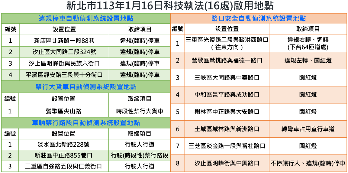 新北警表示,本次科技執法規劃偵測數種違規(闖紅燈、違規停車、行駛人行道、未依規定轉彎、未依管制規定行駛、未依標誌標線號誌行駛等),都是容易致生交通事故、擾亂行車秩序之違規行為。其中11處係採輪動式租賃之方式,未來可視交通改善狀況再行調整;另汐止區明峰街與中興路口更是校園周邊道路,藉由偵測、取締綠底枕木紋行人穿越道線車輛不停讓行人,以及周邊標線型人行道、禁止臨時停車線違規停車等行為,以維護學童通行安全。