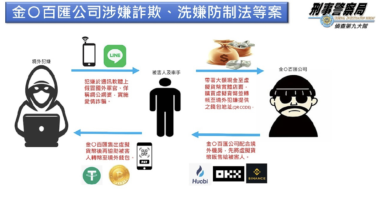 該明面上是虛擬幣商實際是洗錢集團配合境外詐騙機房,以伊拉克軍官、聯合國官員或互稱網公網婆的愛情詐騙話術誘使被害人深陷溫柔鄉,隨後再指引其去「金牛百匯」公司交付現金以虛擬貨幣將被害款項提供給詐欺集團,「金牛百匯」公司協助洗錢並從中牟取暴利。