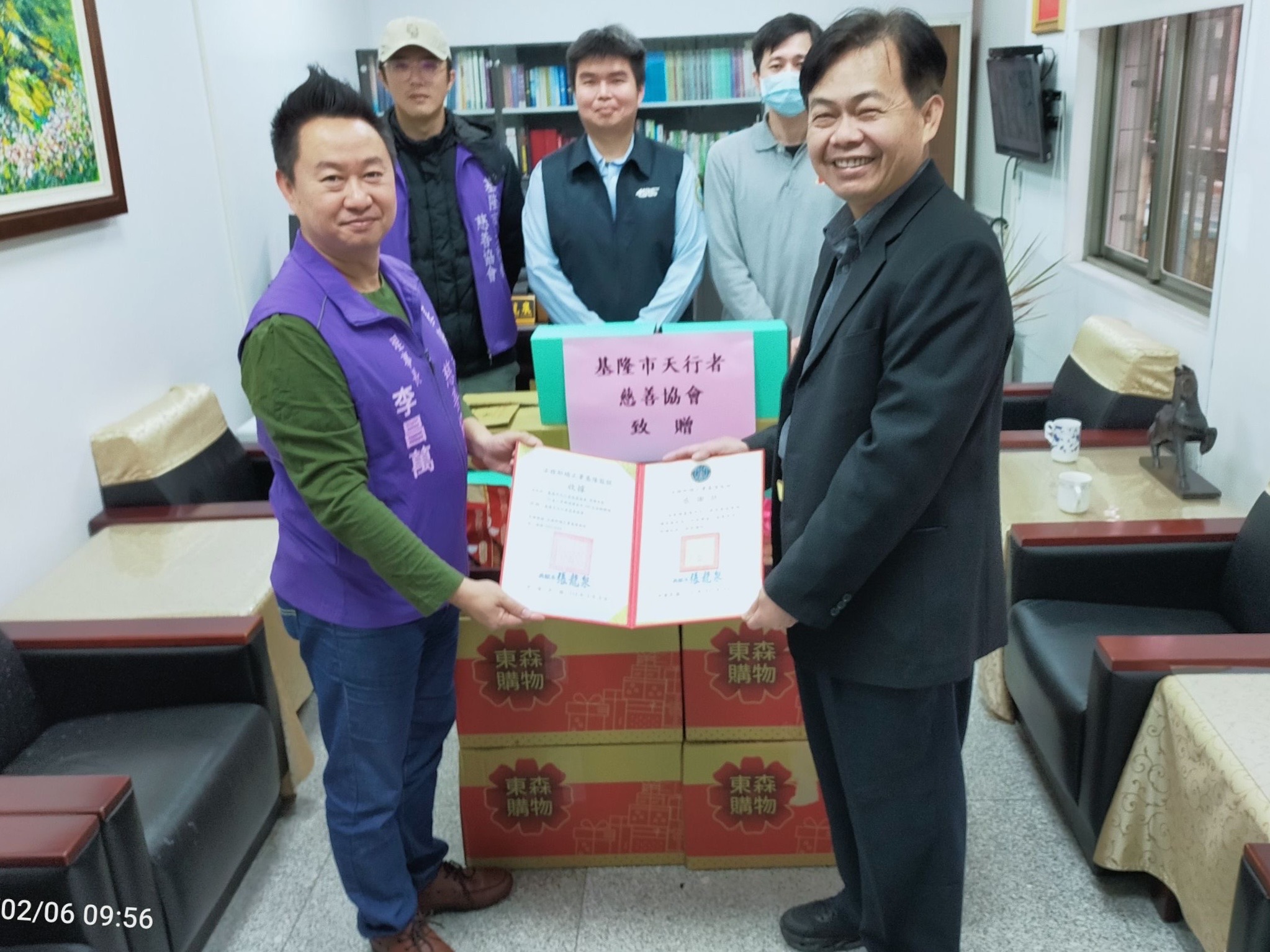 今(6)日基隆市天行者慈善協會理事長李昌萬、執行長黃永翔及志工夥伴,準備210包人參雞湯禮盒、240包金鋼雞翅,前往基隆監獄及基隆看守所分別贈送給受刑人及收容人使用,在年節前送暖,除夕加菜使用,希望可以緩解受刑人及收容人的思念之情,也期盼他們可以順利復歸社會。
