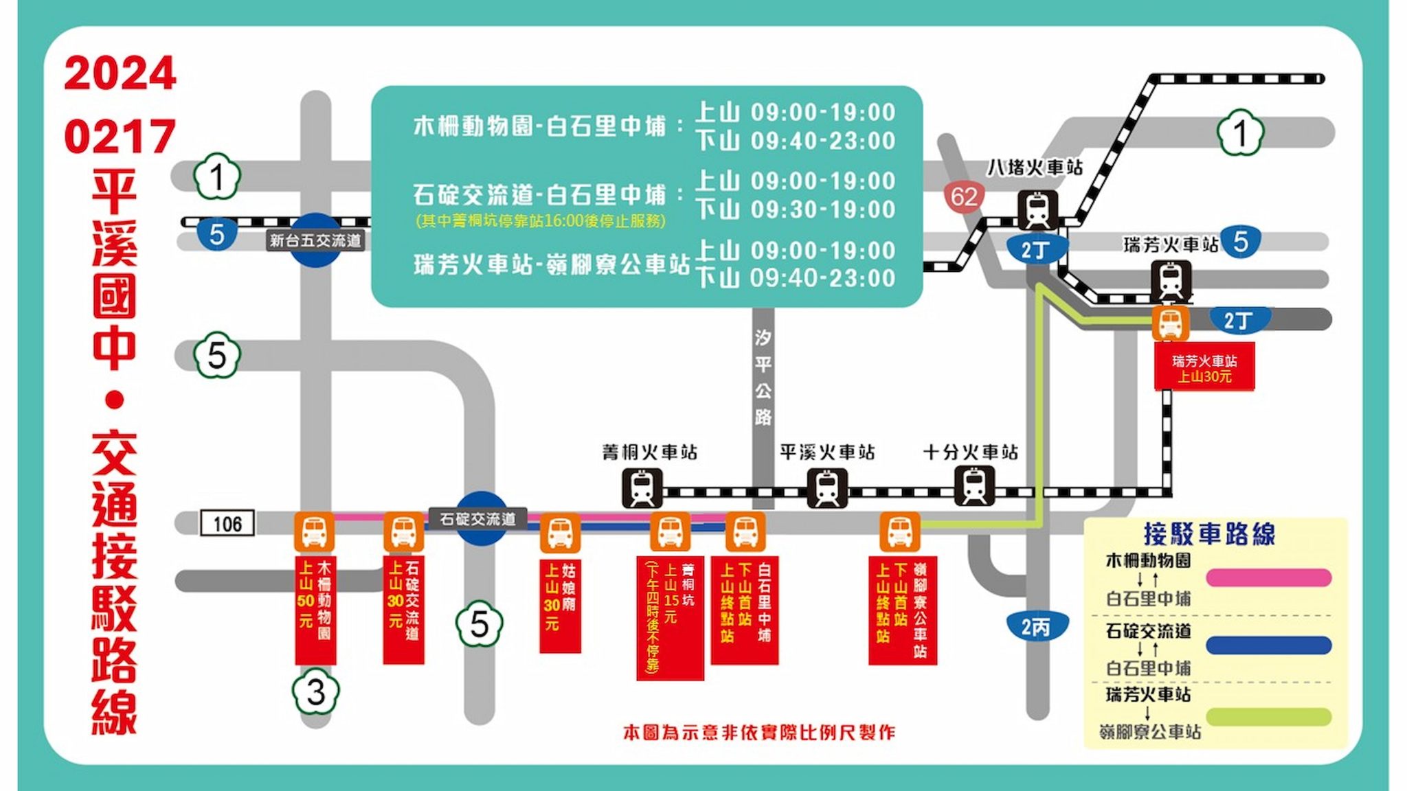 本年活動期間將自上午10時30分起至下午11時止,對106線實施交通管制,從新店區文山路與石碇交流道口至瑞芳區106線頂坪路口,除領有通行證車輛、接駁公車、媒體採訪車、工作人員車輛外,餘均不得進入。本年活動接駁車服務,民眾可從木柵動物園、石碇交流道、瑞芳、雙溪及基隆火車站,搭乘接駁車前往活動會場。2/17市府規劃3條交通接駁路線,分別為木柵動物園—白石里中埔線、國道5號石碇交流道—白石里中埔線及瑞芳火車站—嶺腳寮,2/24規劃5條交通接駁路線,分別為木柵動物園—十分南山橋、國道5號石碇交流道—十分南山橋、瑞芳火車站—十分基平橋、基隆火車站—十分基平橋及雙溪火車站—十分基平橋;另活動2日臺鐵平溪支線列車時刻,將配合活動調整,時刻表請至臺鐵公司網頁查詢或參考車站現場公告,並留意末班車時間。