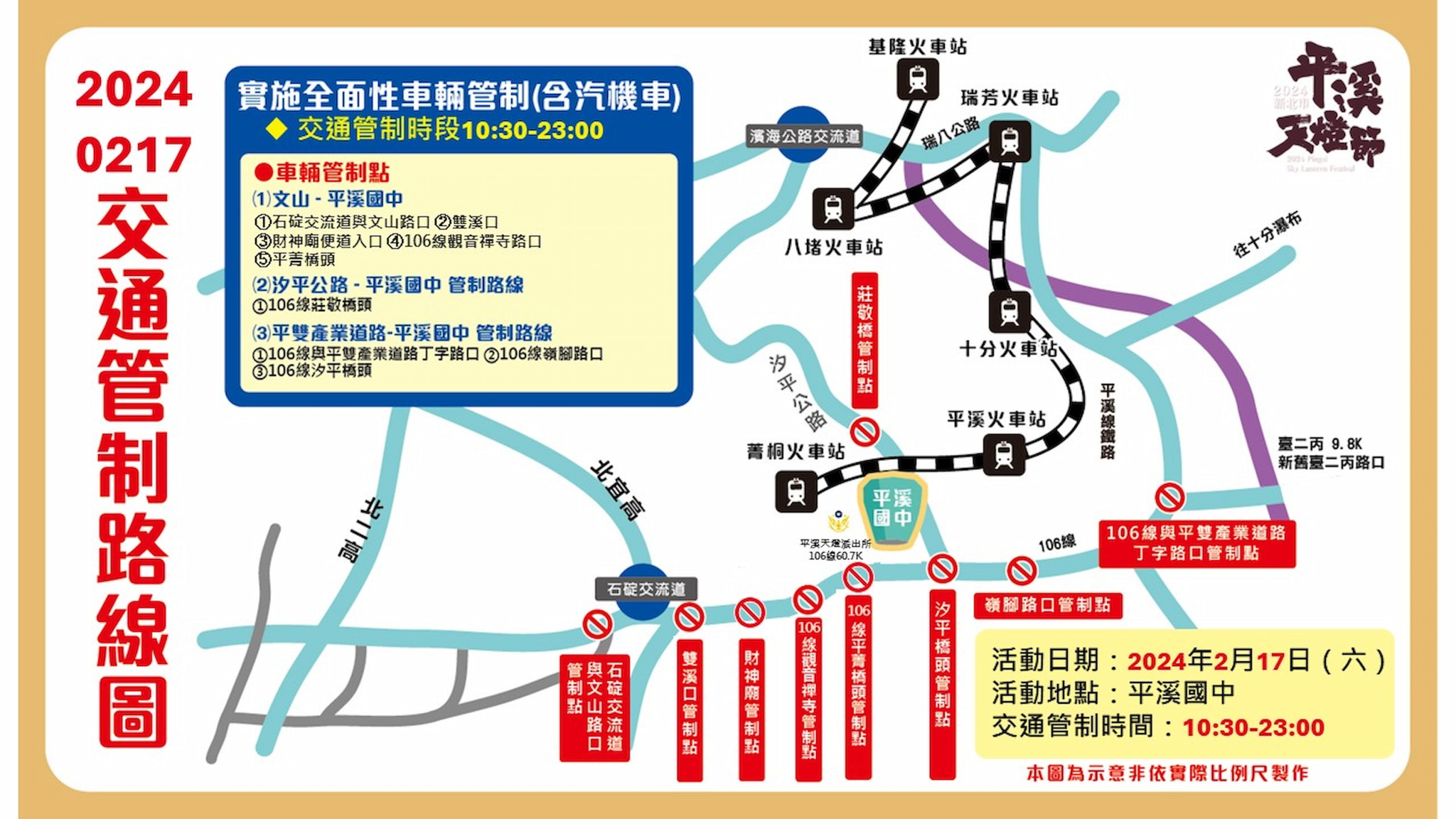 本年活動期間將自上午10時30分起至下午11時止,對106線實施交通管制,從新店區文山路與石碇交流道口至瑞芳區106線頂坪路口,除領有通行證車輛、接駁公車、媒體採訪車、工作人員車輛外,餘均不得進入。本年活動接駁車服務,民眾可從木柵動物園、石碇交流道、瑞芳、雙溪及基隆火車站,搭乘接駁車前往活動會場。2/17市府規劃3條交通接駁路線,分別為木柵動物園—白石里中埔線、國道5號石碇交流道—白石里中埔線及瑞芳火車站—嶺腳寮,2/24規劃5條交通接駁路線,分別為木柵動物園—十分南山橋、國道5號石碇交流道—十分南山橋、瑞芳火車站—十分基平橋、基隆火車站—十分基平橋及雙溪火車站—十分基平橋;另活動2日臺鐵平溪支線列車時刻,將配合活動調整,時刻表請至臺鐵公司網頁查詢或參考車站現場公告,並留意末班車時間。