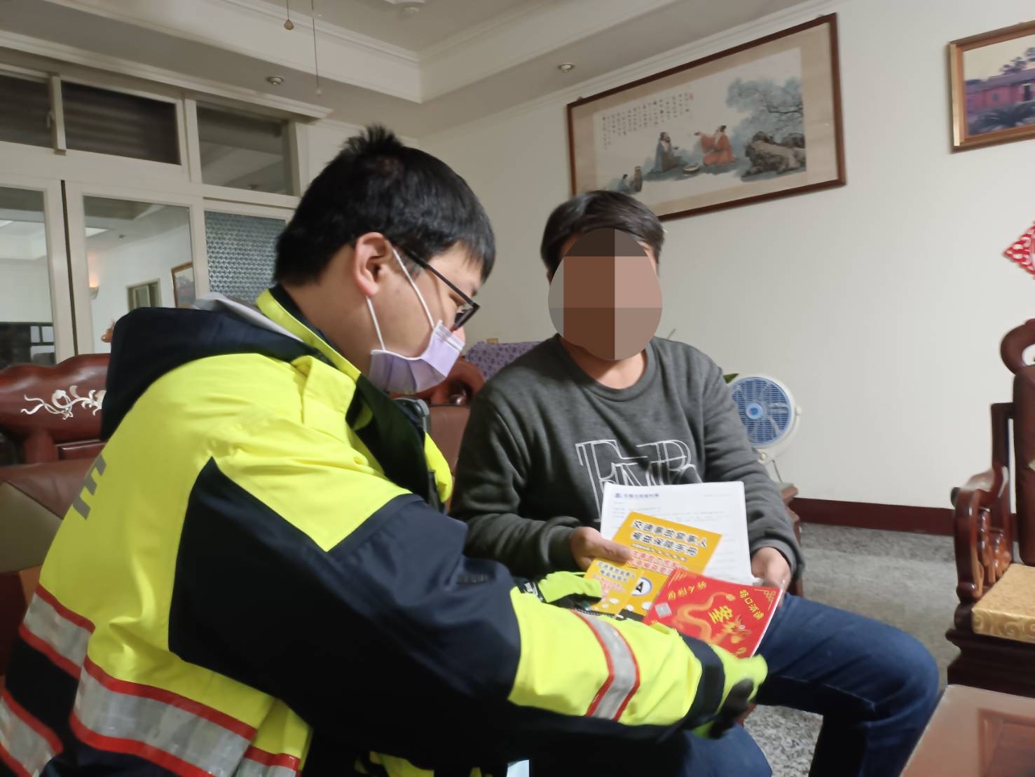 因考量邱男對交通法令不熟、心情低落及近期失業在家無經濟收入,恐有自殺之想法,為避免憾事發生,警方遂準備交通法規、交通事故相關資料及乾麵食物資至邱男位在蘆竹區富國路住處拜訪,邱男見到警方前來,初時談論亦忍不住放聲大哭,眼淚不斷潸然淚下,警連忙遞上衛生紙給邱男擦拭眼角淚水,提醒其要遵守相關交通法令勿違規,有空可多閱讀警方提供之交通法規及交通事故知識資料,亦鼓勵其過完年後要在附近公司工廠找一份正當工作,勤奮賺取收入自用及孝敬年邁父母,叮囑其求職詐騙案件多,勿任意提供個人銀行帳戶存摺正本、提款卡及證件給不明人士,更不要交給對方手機門號使用。