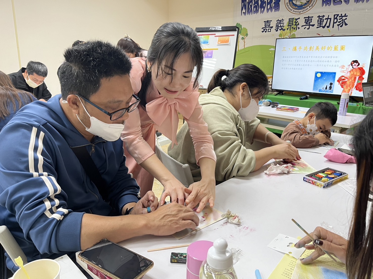 潘羽姍在課程中除了講授跨國婚姻家庭經營與多元文化等主題,為了鼓勵新住民夫妻一起彩繪人生藍圖,特別在課程安排和諧粉彩手作課程,只要運用手指頭及簡單的工具,將和諧粉彩的粉末在畫紙上慢慢上色,就可繪成一幅美麗的作品,創作過程不僅可以紓解壓力及情緒,還可以增加新住民夫妻互動,藉由粉彩創作表達平常不敢說出口的甜蜜話語,手作卡片也更能表達內心情感,為夫妻間感情增溫。