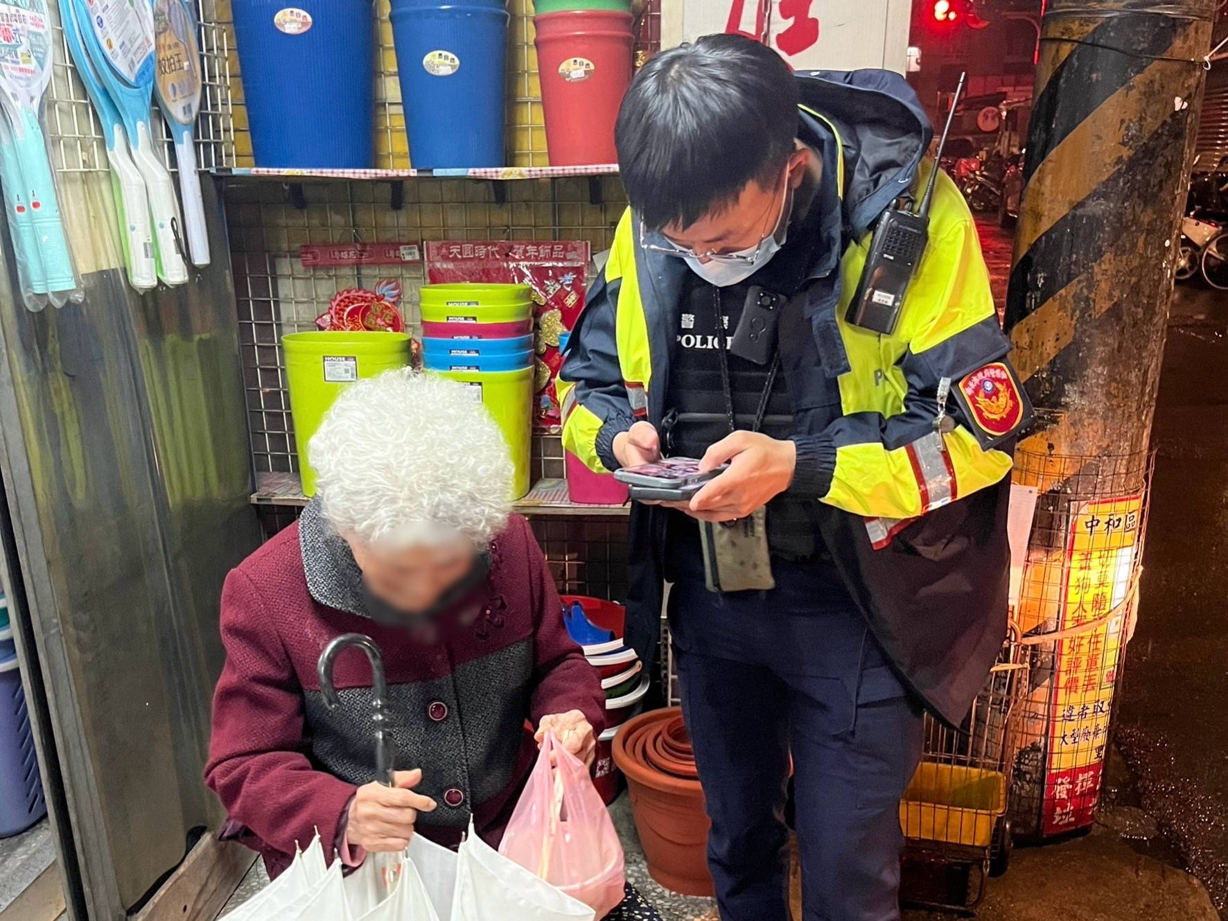 吳、黃2員趕往現場,李婦說晚間嘴饞想要出門買點心,但走著走著無法確定方向,再加上天色昏暗,便迷了路找不到回家的路,吳員詢問李婦是否記得住家地址或電話,李婦卻記不起來,在旁協助的黃員越看越覺得李婦眼熟,靈機一動查看工作交流群組,果然在群組中找到其他員警曾經協助李婦返家的照片和紀錄,黃員立即查證當時李婦留存的身分資料,這才發現原來李婦的住處就在附近,當時時間已接近晚間10時,還下著綿綿細雨,吳、黃2員見李婦手拿餐點且步行緩慢,為了不讓李婦在寒冷的天氣下又淋到雨,便在一旁為李婦撐傘,小心翼翼攙扶其上車,送李婦安全返家。