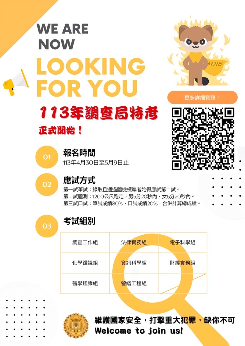 法務部調查局的最新公告,特考報名日期自113年4月30日起至5月9日止,歡迎年齡在18歲以上、30歲以下的有志青年男女踴躍報考。特考旨在招募具有志向且積極參與打擊犯罪、維護國家安全的人才,並加入調查局的行列。