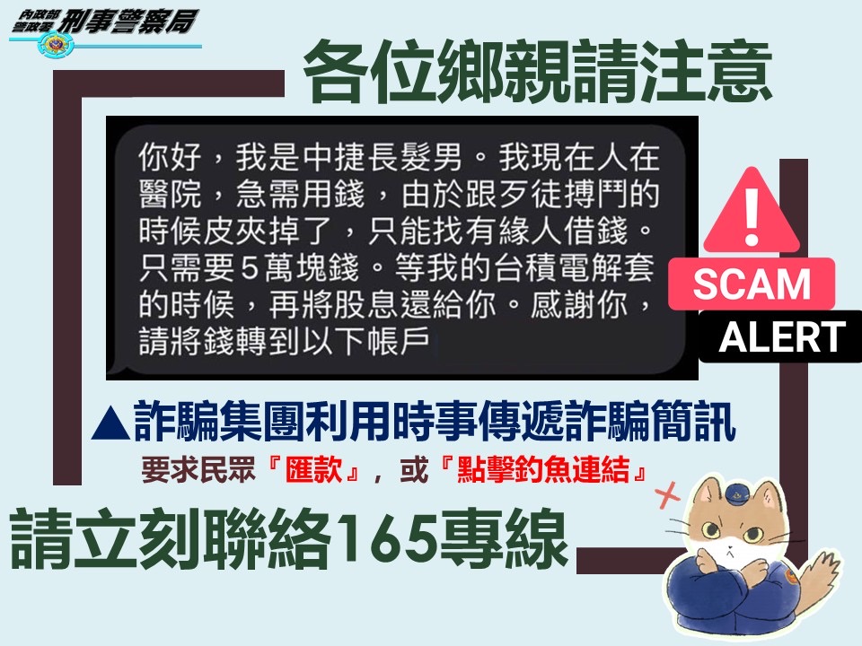 因阻擋洪男於台中捷運無差別刺人而被網友封作英雄的「中捷長髮男」,疑似遭不肖歹徒透過簡訊佯稱「因住院急需用錢,因為與歹徒搏鬥時,皮夾掉了,還稱只需要5萬元,等台積電解套的時候,再用股息歸還,要求被害人將錢轉到帳戶內」,刑事警察局已經主動偵辦該起案件,呼籲民眾切勿相信詐騙簡訊,如收到類似訊息,可主動撥打165反詐騙諮詢專線查詢。