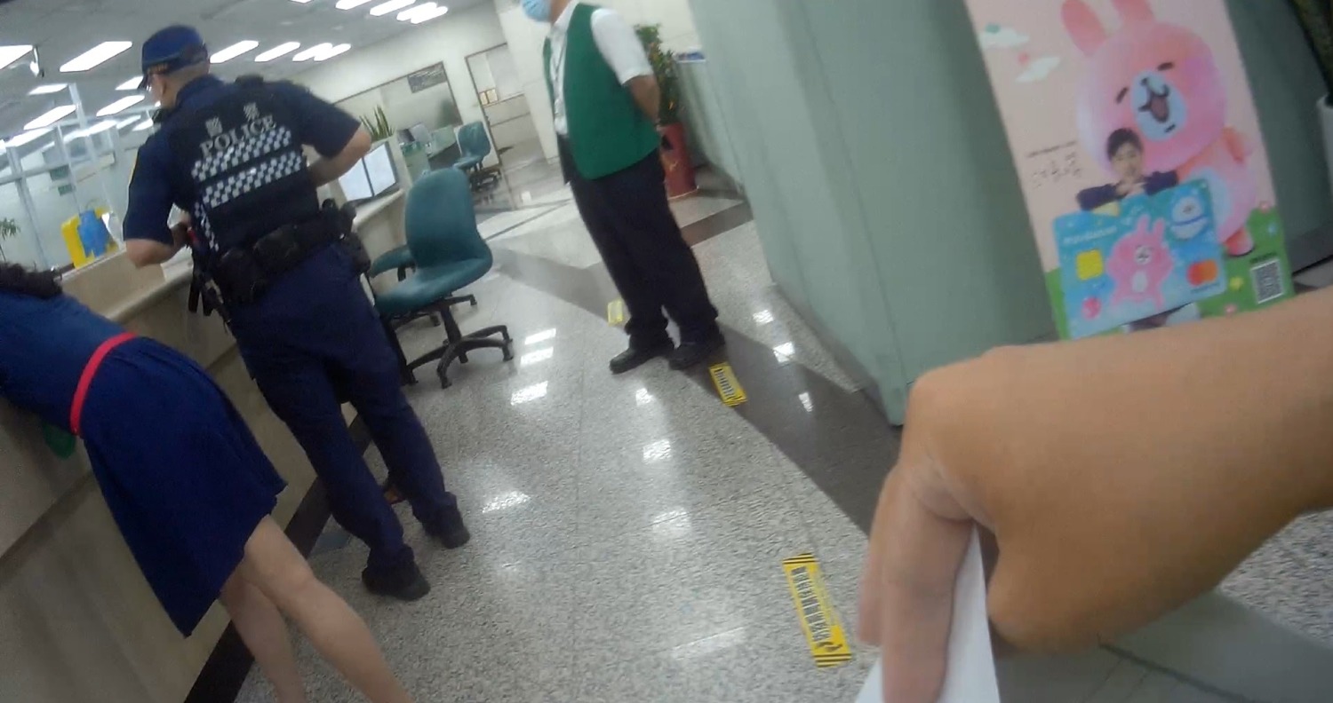 中市警一分局民權派出所日前接獲合作金庫銀行中權分行來電,稱有一名婦人疑似遭詐騙集團所騙,亟需警方協助。警員陳毓倫、林坤達獲報後,迅速趕赴現場了解,並在警方耐心勸說下,成功保住該婦人的積蓄!