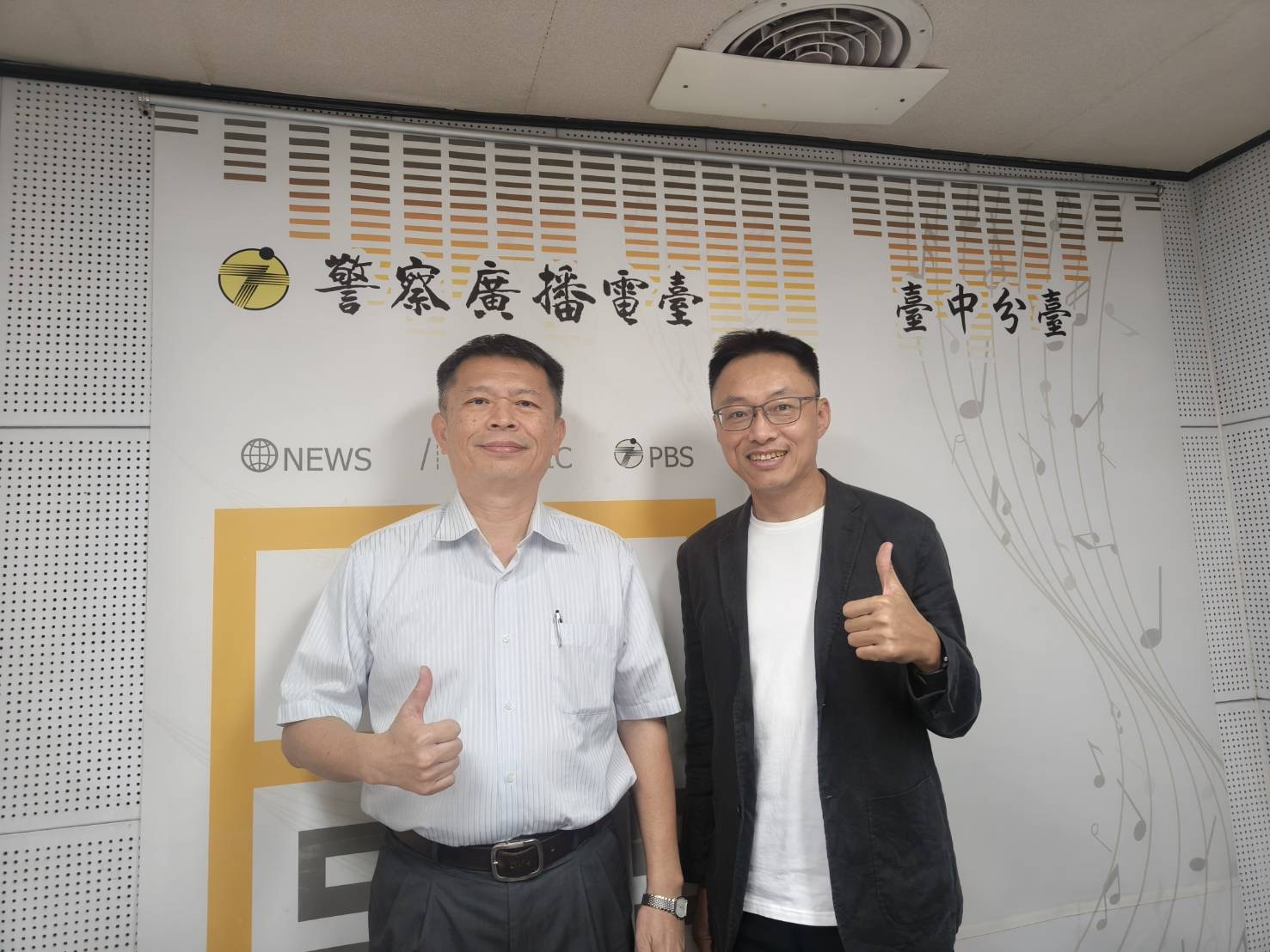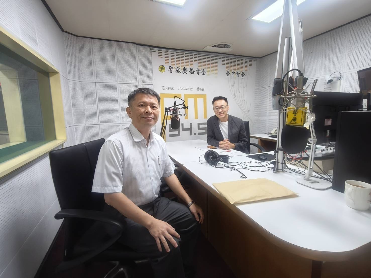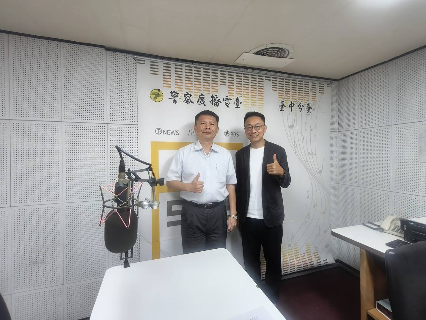 和平警分局副分局長蔡進勝於昨(25)日上午親至警察廣播電台臺中分臺,參加知名主持人季謙主持的「945 會客室」節目專訪,在空中暢談介紹和平地區主要風景區交通概況及大雪山中專一線暑期交通疏運措施等,與聽眾們博感情並呼籲民眾注意詐騙集團手法變化多端,臺中市政府警察局推動「警銀聯阻防詐」協作計畫,長期與銀行機構行員合作攔阻民眾遭詐騙款項,並定期由市長於治安會報公開表揚攔阻詐騙有功金融機構行員、超商店員等治安貢獻有功民眾,增加市民榮譽感,成為警方強而有力的夥伴。