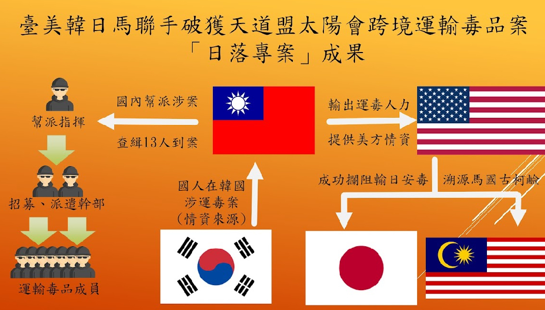 5月底該批車手蠢動,專案小組研判時機成熟,洽請美方進行嚴查攔阻,查獲24瓶液態甲基安非他命,經刑事局與美方達成向上擴大溯源共識,美方同意驅逐戴姓運毒車手等4人離境返臺以利我方逮捕,進而掌握國內太陽盟幹部鄭姓主嫌指揮操持旗下成員擔任運毒車手。專案小組迄今共計執行6次國內拘搜行動,查獲13名犯嫌,均依涉犯違反「組織犯罪防制條例」、「毒品危害防制條例」等罪,由承辦檢察官向法院聲請羈押獲准。