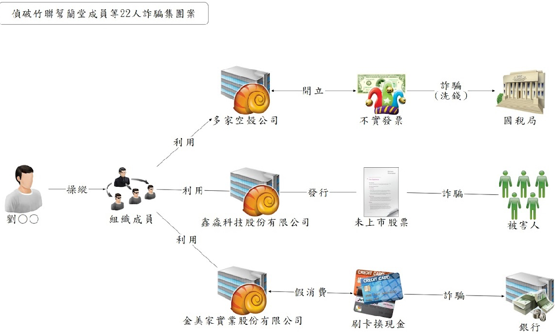 以劉姓犯嫌為首之犯罪集團具竹聯幫蘭堂背景,該集團從事多元化詐欺,除收購人頭擔任旗下空殼公司負責人,再以空殼公司名義大量開立不實發票來幫助他人逃漏稅及洗錢,從中牟取暴利,不法獲利高達數千萬元;於105年起利用「鑫淼科技股份有限公司」之名義發行「未上市股票」,並稱「公司從事未來科技,前景看好,保證上市櫃之後,股票飆漲,就能賺大錢」欺騙民眾投資空殼公司,導致被害人損失數千萬元,更於106年間以「金美家股份有限公司」名義在大臺北地區以未實際買賣交易之「刷卡換現金」方式,收取手續費,再以空殼公司之名義開立不實發票來抵銷相關稅額,誆騙稅務單位用以洗白不法獲利,亦使刷卡民眾變相成為劉嫌詐騙及洗錢犯罪集團之共犯。