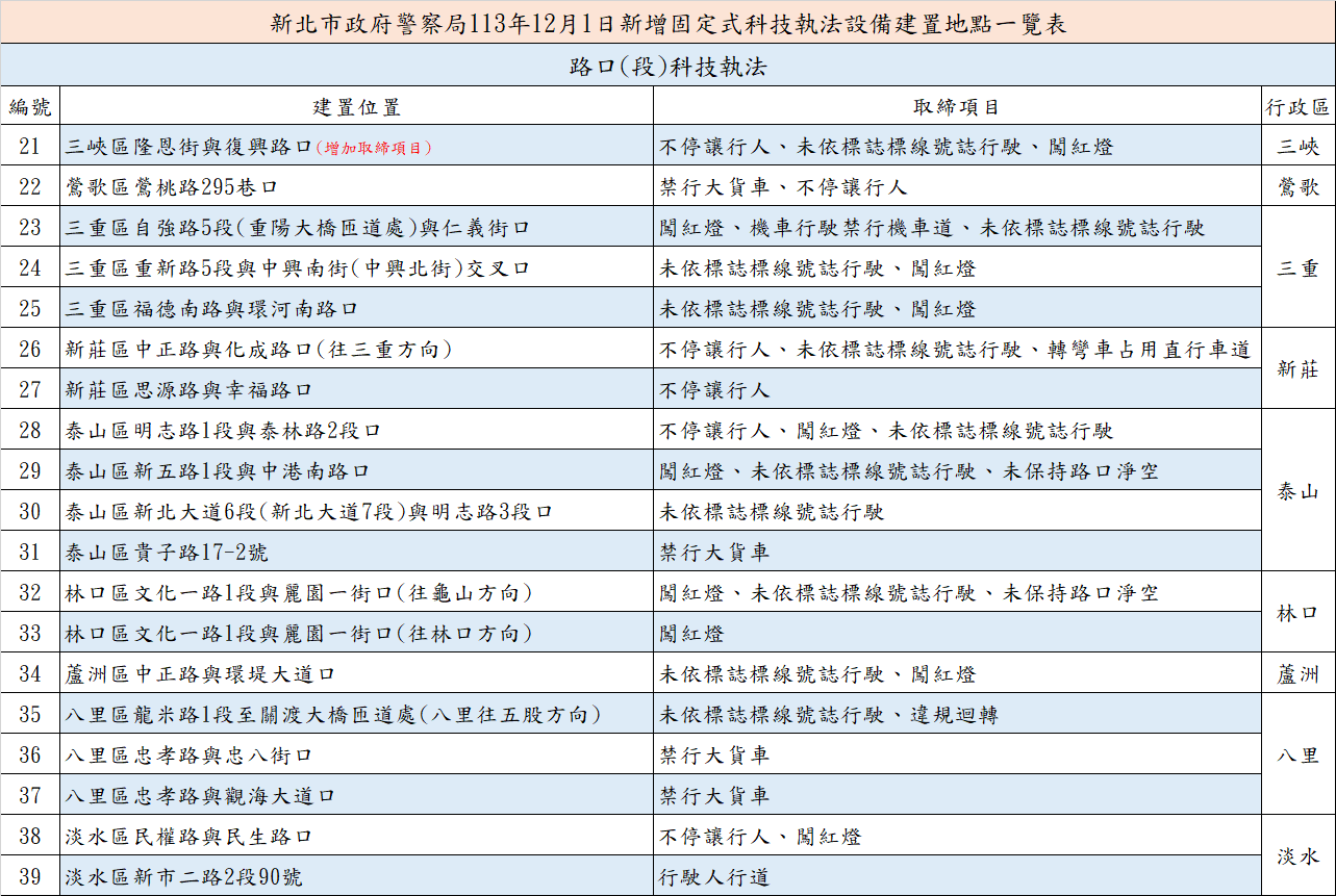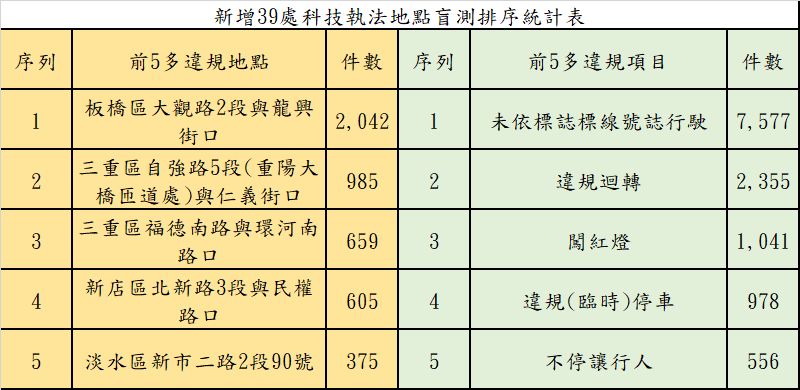 新北警篩選出39處易肇事及易違規路口,建置多功能科技執法設備,採用AI人工智慧辨識違規行為,已於10月份公告預計於113年12月1日正式執法,且同年9日20日開始39處科技執法盲測,統計科技執法偵測違規前5多地點為板橋區大觀路2段與龍興街口(2,042件)、三重區自強路5段(重陽大橋匝道處)與仁義街口(985件)、三重區福德南路與環河南路口(659件)、新店區北新路3段與民權路口(605件)、淡水區新市二路2段90號(375件);科技執法偵測前5多違規項目為未依標誌標線號誌行駛(7,577件)、違規迴轉(2,355件)、闖紅燈(1,041件)、違規(臨停)停車(978件)、不停讓行人(556件)。