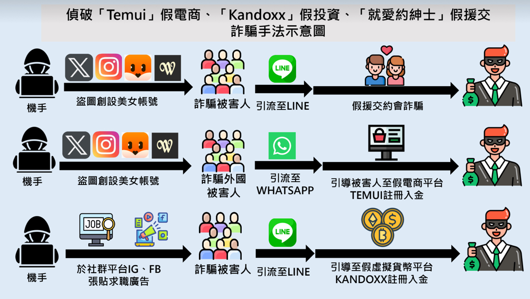 專案小組偵查發現,新竹黑幫風飛砂集團葉姓及宋姓男子,新竹縣新豐鄉及湖口鄉等地設立假投資及假援交詐欺機房,由詐欺機房機手盜用美女頭貼於社群軟體X、IG、FB及Whatsapp等社群平台創設帳號,與境外及境內被害人聊天,並以下列3種手法詐騙被害人: