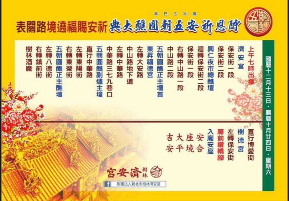 【警政時報 徐煜勝/新北報導】樹林濟安宮將於今(13)日舉行「樹林濟安宮酬恩祈安五朝圓醮徒步賜福遶境」活動,預計吸引約1,500名信眾及10餘陣頭共同參與,場面盛大。為確保遶境活動順利進行及維護沿線交通安全,樹林警分局將動員警力35名、義交31名,於活動期間針對重要路段與路口實施彈性交通管制。