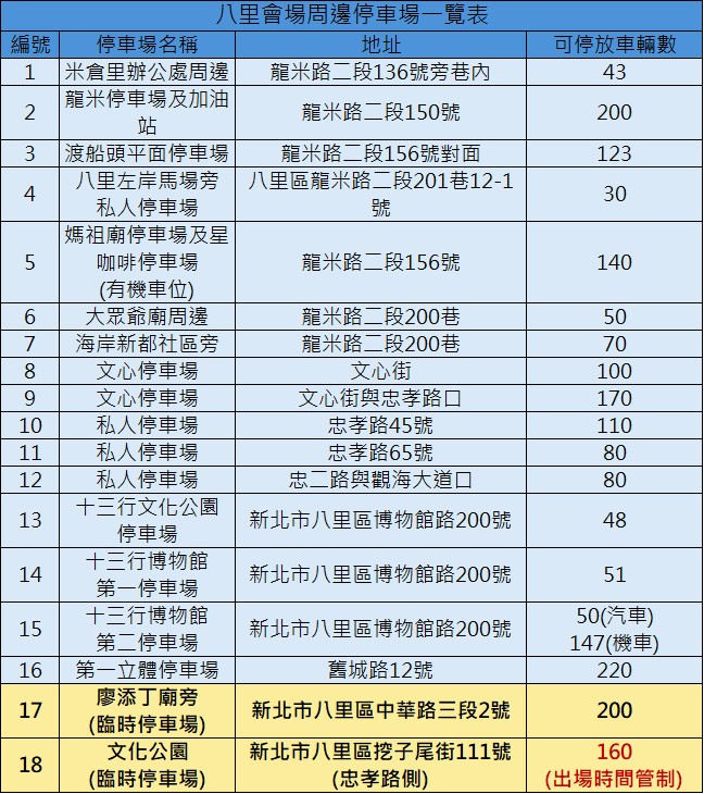 (1) 下午2時起八里北堤沙灘入口處管制禁止車輛進入