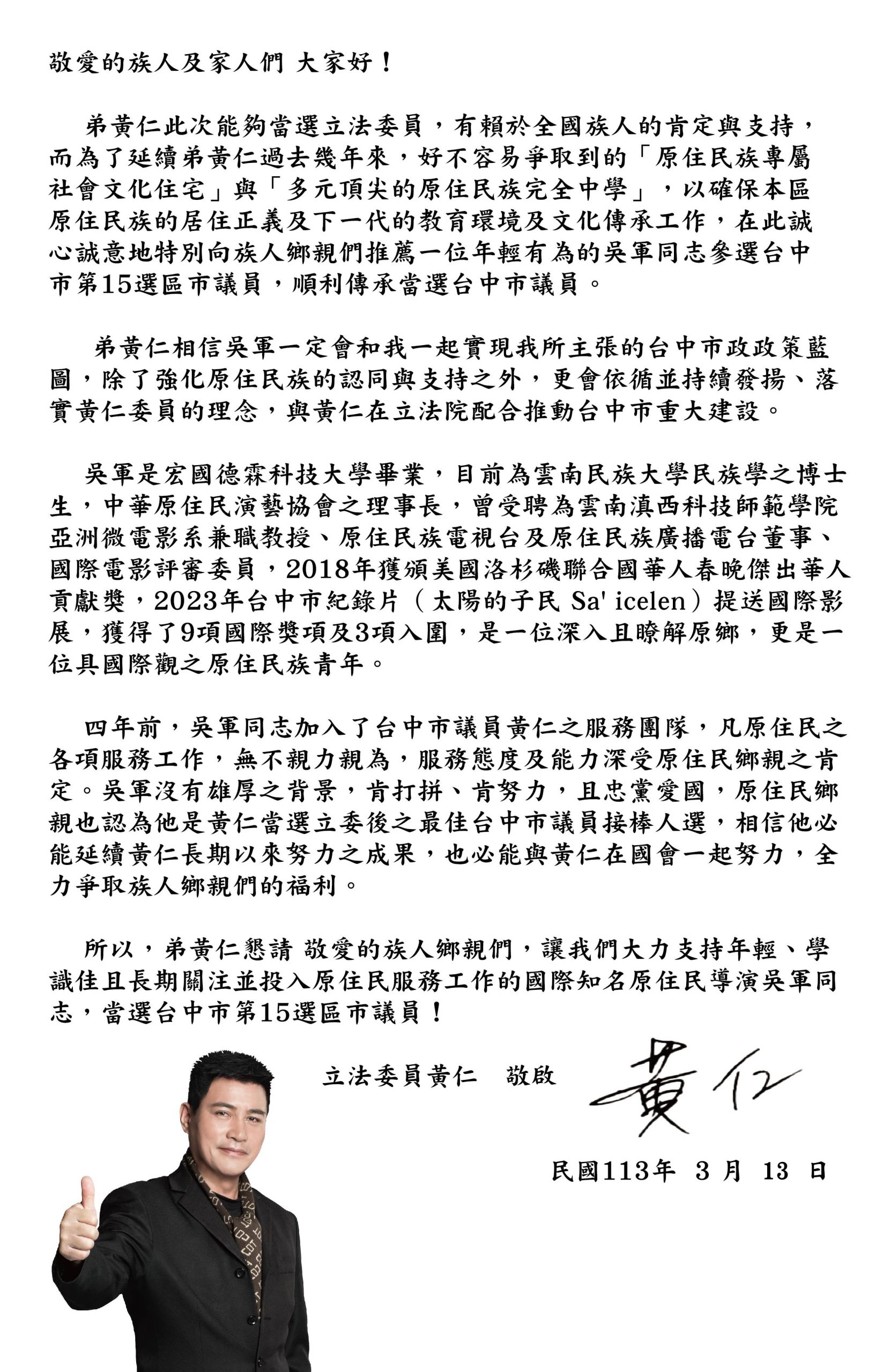 立委黃仁指出,他和吳軍誓與韓院長同行,全力支持!呼籲支持者們4月13日力將手中神聖的一票支持力挺國民黨提名的候選人吳軍,讓吳軍延續他服務大台中市民,持續為推動建設大台中打拼。