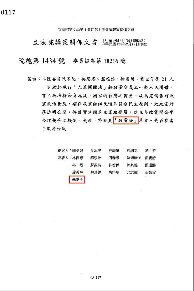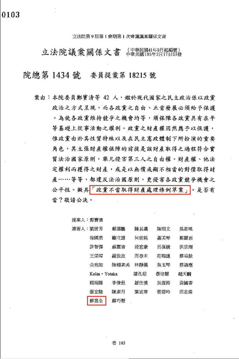 傅崐萁也秀出立法院關係文書院總第1434號等委員提案指出,前立法院長蘇嘉全任內,也是「政黨不當取得財產處理條例草案」、「政黨法草案」的連署人,請柯建銘、民進黨不要再潑糞,「自己做過的事,別人就不能做,這就是『綠能』你不能!」。