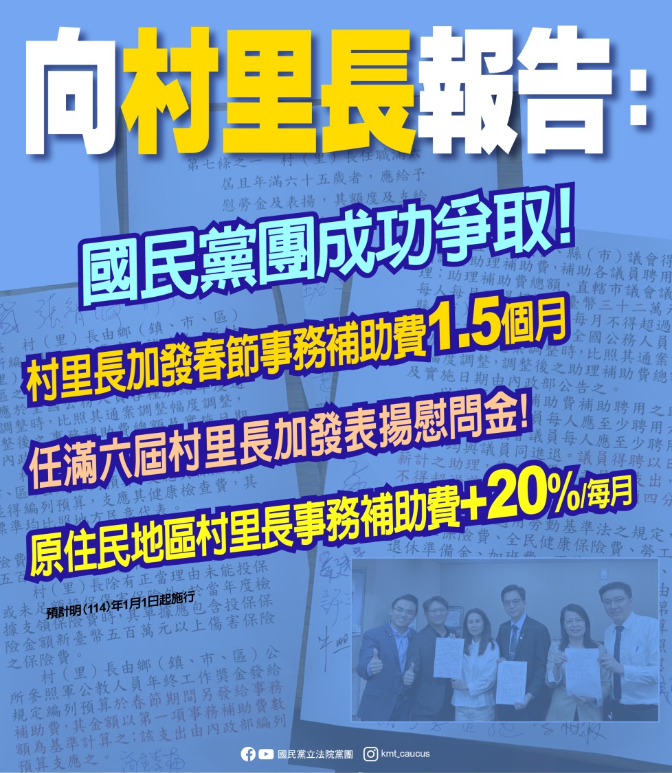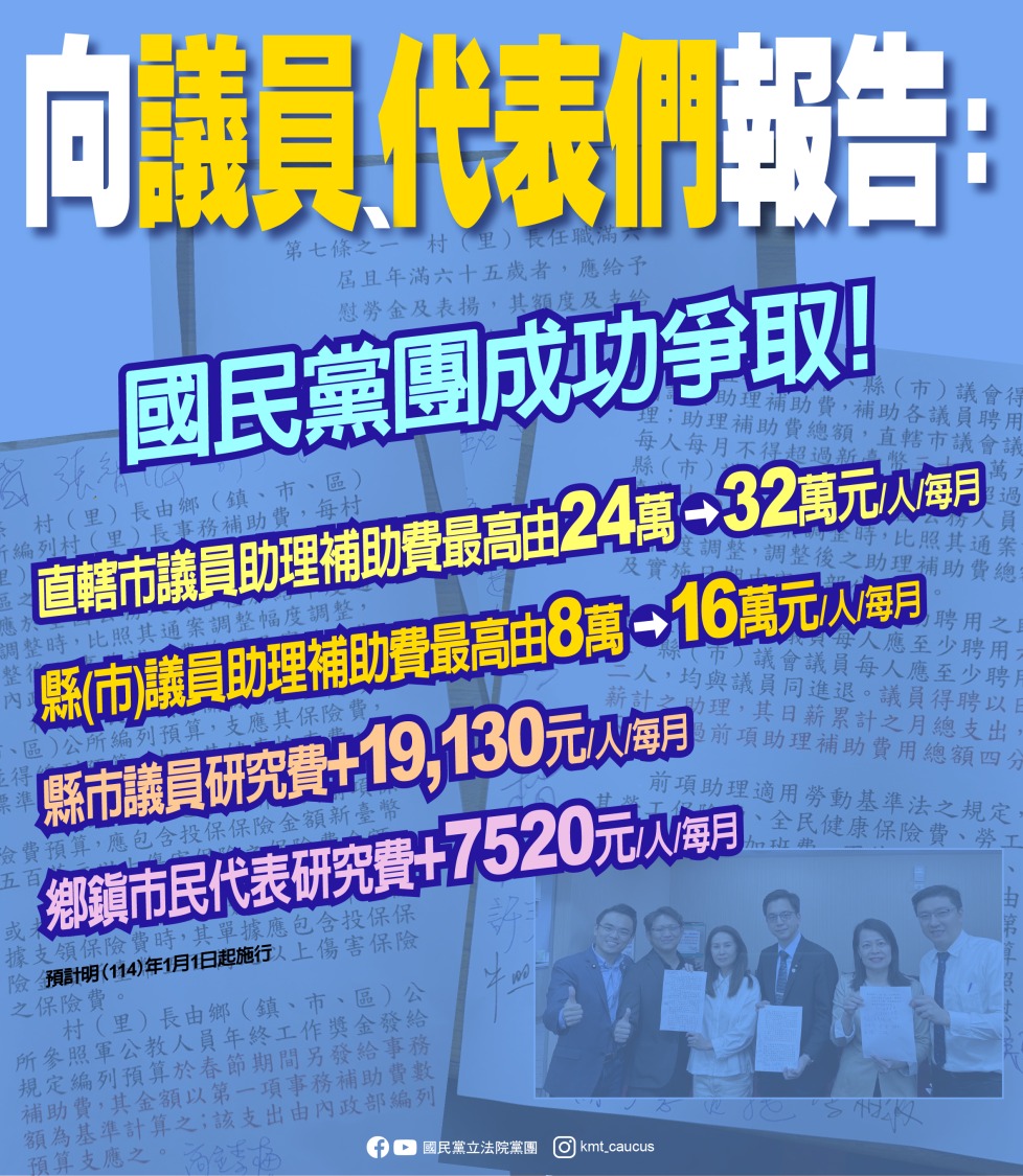 國民黨版提案「地方民意代表費用支給及村里長事務補助費補助條例修正草案」,上週在立法院院會表決通過。(圖/黃仁國會辦公室提供)