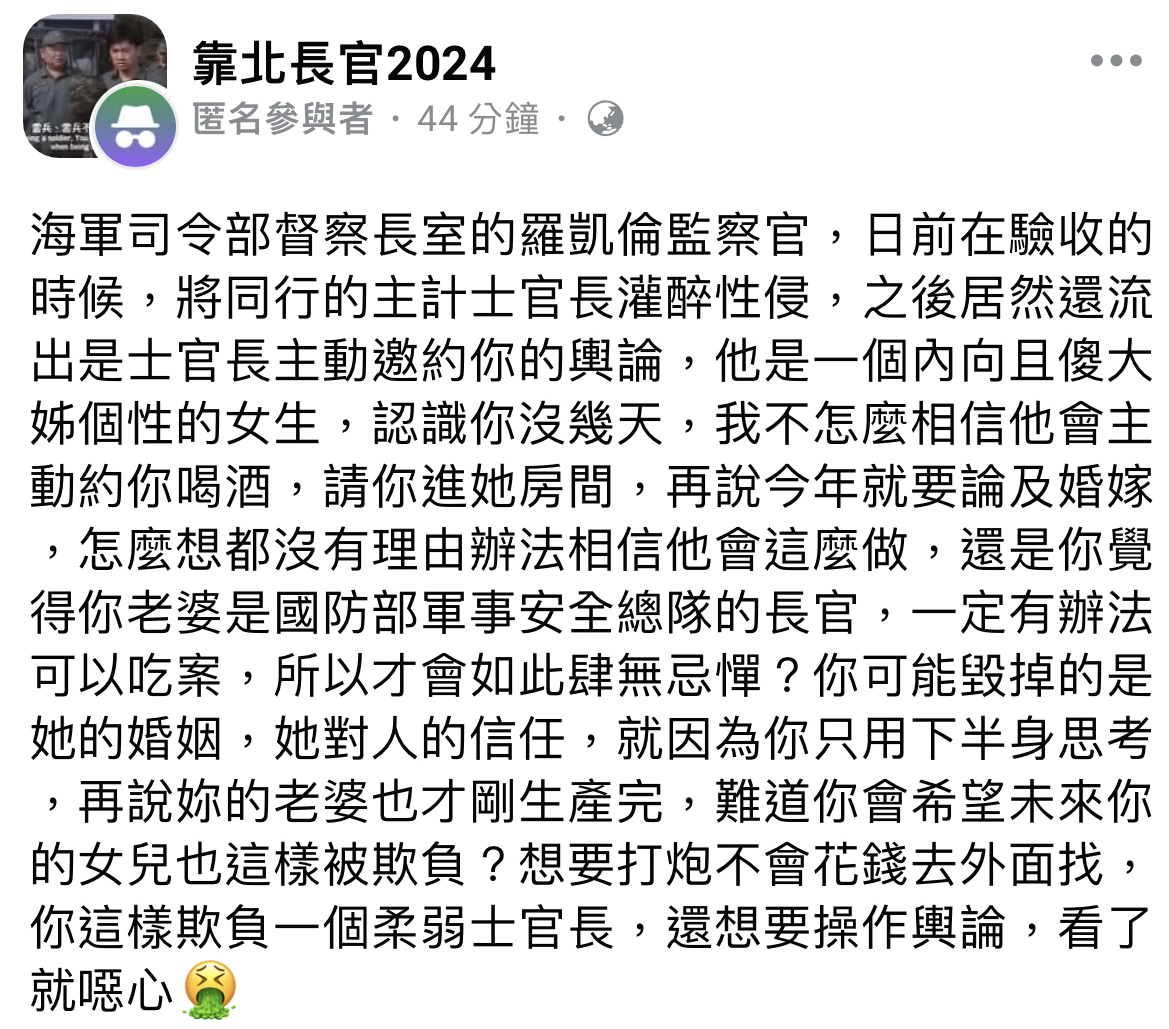 女士官長指出,他和羅凱倫認識才沒幾天,怎麼可能會主動邀約到自己房間喝酒?羅事後竟蓄意流出是自己邀約羅喝酒的訊息,其用下半身思考,犯錯還意圖掩飾的做法真的令人作噁。