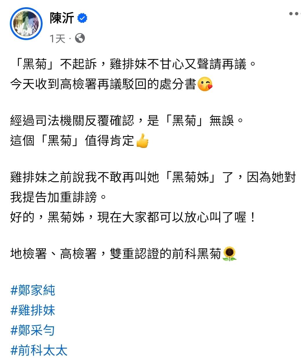 「雞排妹」不滿遭死敵陳沂稱呼「黑菊姐」,對陳沂提告加重誹謗,檢察官偵結裁定不起訴,雞排妹不服提出再議,日前遭高檢署駁回,維持原不起訴處分。對此,陳沂19日收到高檢署再議駁回處分書後,笑稱雞排妹是「地檢署、高檢署」雙重認證的「黑菊姐」,未來大家都可以放心叫了!