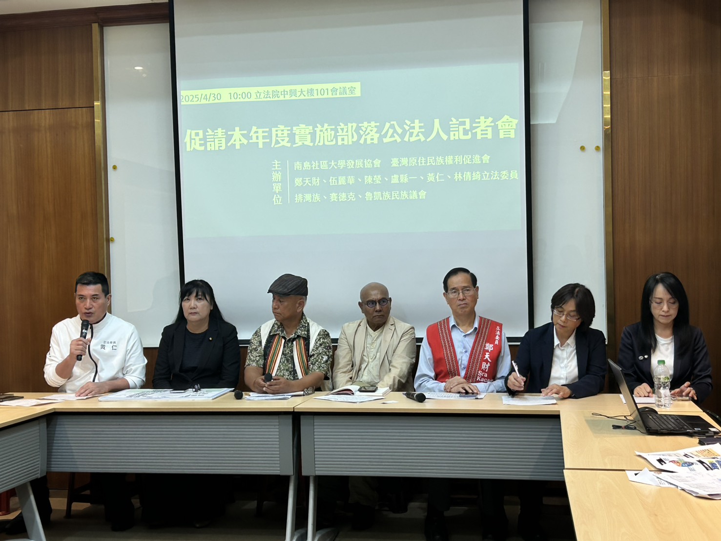 國民黨平地原住民立委黃仁等朝野立委及南島社區發展協會、台灣原住民權利促進會等團體今(20)日上午聯手舉辦「促請本年度實施部落公法人」記者會,植基於憲法增修條文第十條第十二項前段所揭示之原住民族權利,要求政府認可部落公法人地位等同現行職業團體、社會團體及政治團體等法人組織,接受各該事業主管機關之指導、監督。