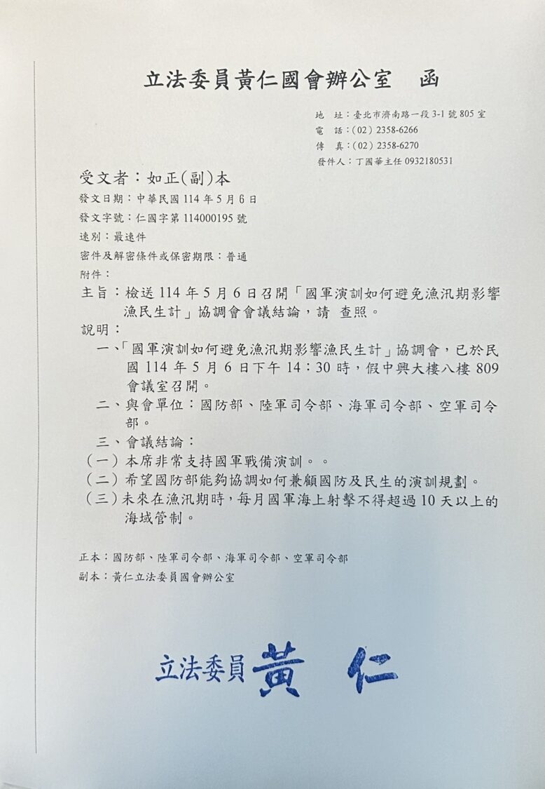 經黃仁親自出面協調,國防部上校副處長楊萬里等出席官員同意,未來在漁汛期時,每月國軍海上射擊不得超過10天以上的海域管制。希望透過限縮管制時間,將原本的30天縮減至10天以內,讓國軍火砲射擊演練可能對漁民造成的影響,降至最低。