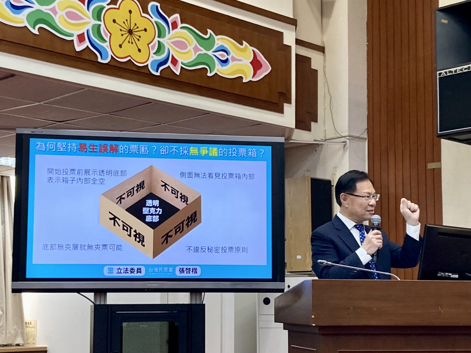 同時,張啓楷也針對2024年總統大選時,屏東縣中正國小146投票箱疑似夾藏選票事件,引發社會重大疑慮,也嚴重影響選務公信力,要求中選會應立即改善現行票匭設計,可考慮使用底部透明壓克力投票箱,主動進行票匭及選務流程的檢討與改革,並明確規範票匭材質及設計標準化解社會可能產生的疑慮。