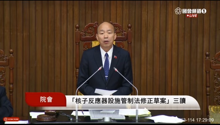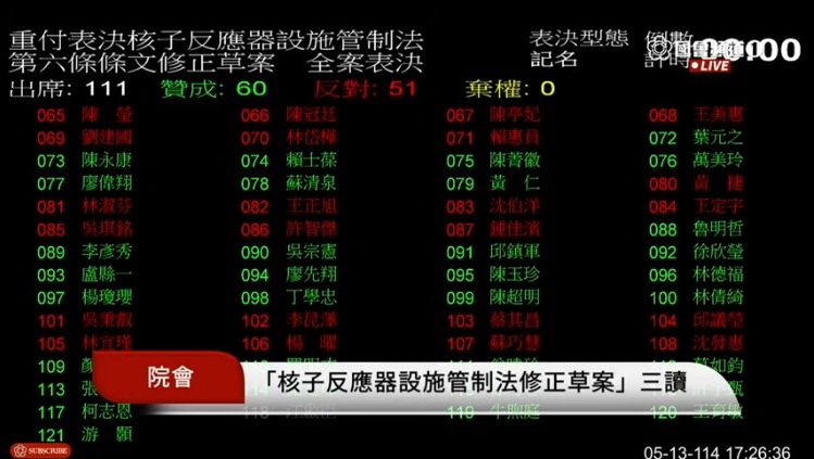 台灣最後一座運轉的核三廠將在5月17日除役,台灣將自此完全喪失核能這項「平價、穩定、超低碳」的供電方式。為防止台灣在「核電歸零」後面臨用電不足,國民黨與民眾黨在今日院會中審議《核子反應器設施管制法》(核管法)修正案,傍晚以絕對多數記名投票60:51三讀通過,在計延長核電廠服役年限並放寬重啟條件,再配合上周通過的「重啟核三公投」,強力扭轉執政黨的「非核家園政策」。