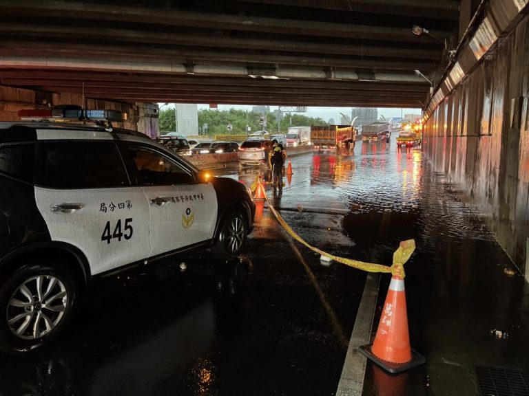 圖片說明:中市五權西路高速公路下的涵洞淹水,警方立即前往疏處。(記者江雁武翻攝)
