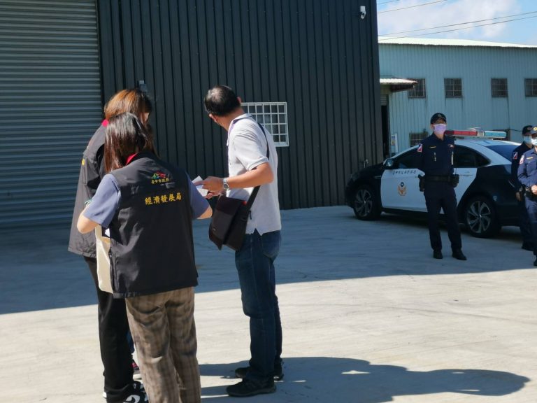圖片說明:市府經發局人員現場進行勘查後,確認「海通水工具行」大型違章倉庫應予短水、斷電。(警政時報記者翻攝)