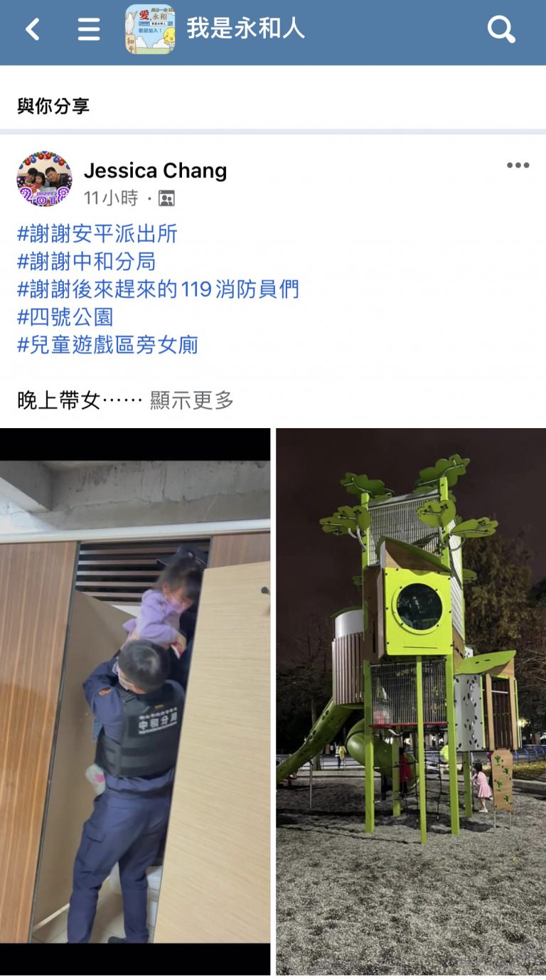 女童反鎖公園廁所內|中和暖警隔牆救援